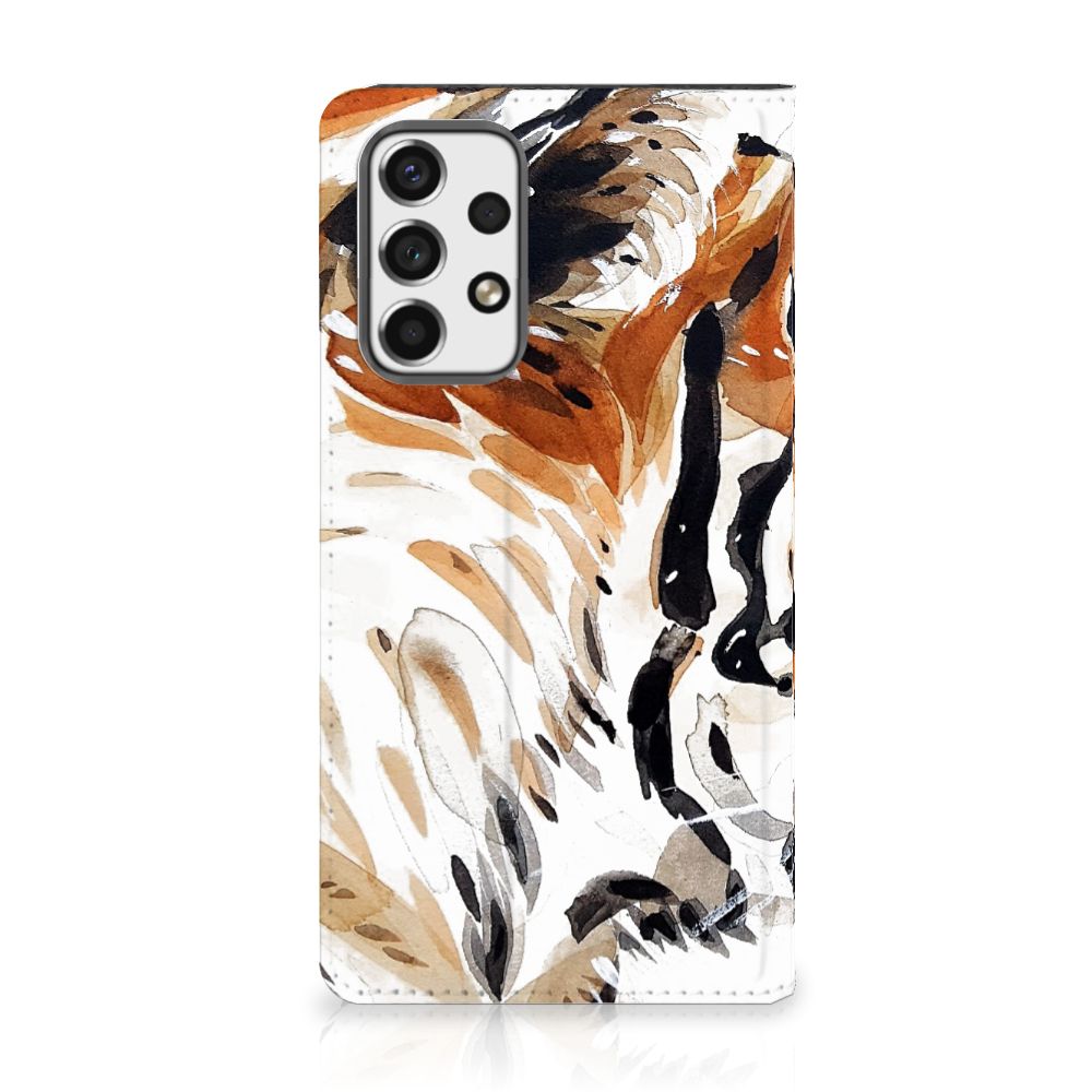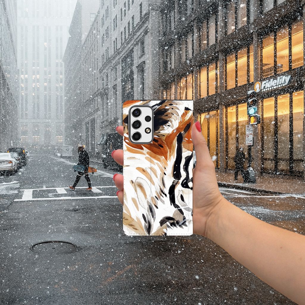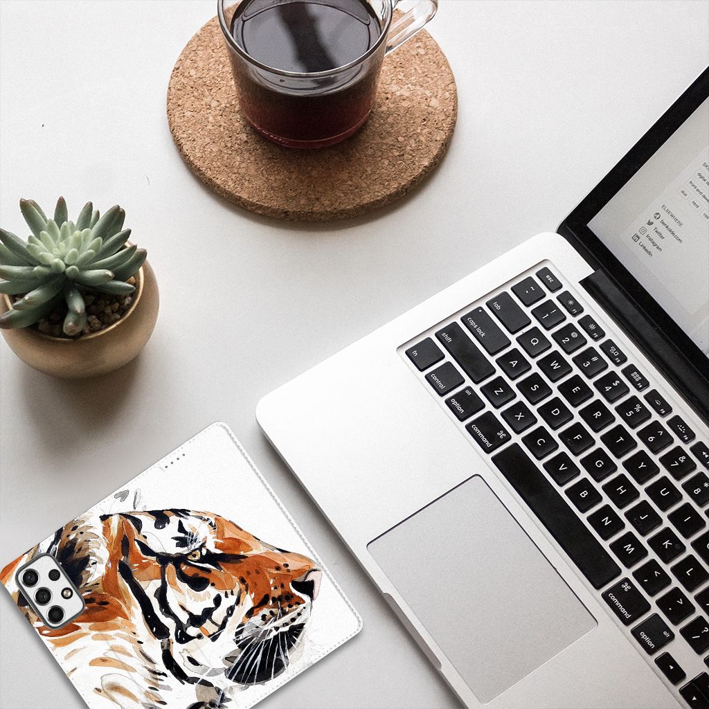 Omdat we tijgers zo bijzonder vinden, hebben we besloten deze voor zeer lage kosten voor jou op een Samsung Galaxy A53 Bookcase te zetten. Dit kunnen we goedkoop doen omdat we het drukwerk in eigen beheer doen. De tijger staat geschilderd op de stand case tegen een grijs met wit geblokte achtergrond. De Watercolor Tiger kunnen we bedrukken op verschillende soorten hoesjes, zoals deze stand cases. Het hoesje met geschilderde tijger tegen grijs met witte achtergrond is van PU-leer (buitenzijde) en TPU (binnenzijde) en beschikt een houder voor bijvoorbeeld je bankpas. Verder is de stand case met geschilderde tijger voorzien van een magnetische sluiting aan de binnenzijde. Jij zorgt voor de perfecte bescherming van je smartphone met dit stand hoesje met geschilderde tijger tegen een grijs met witte achtergrond.