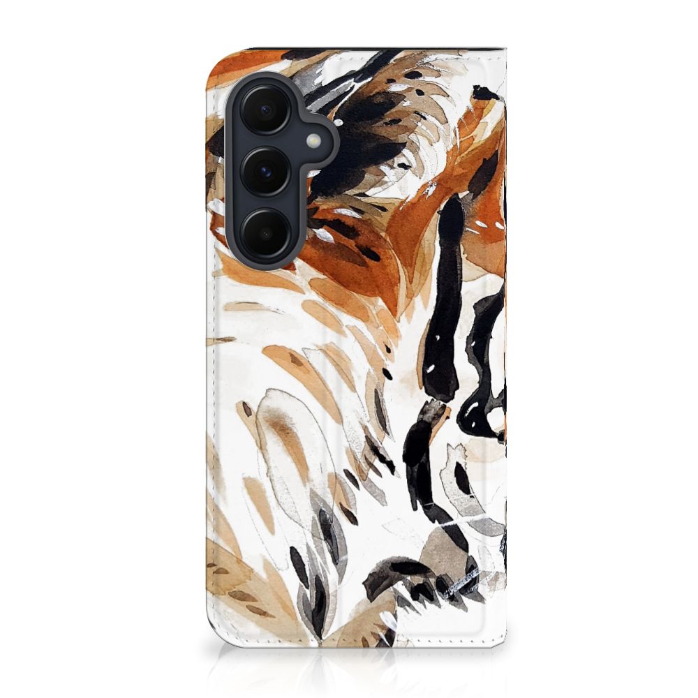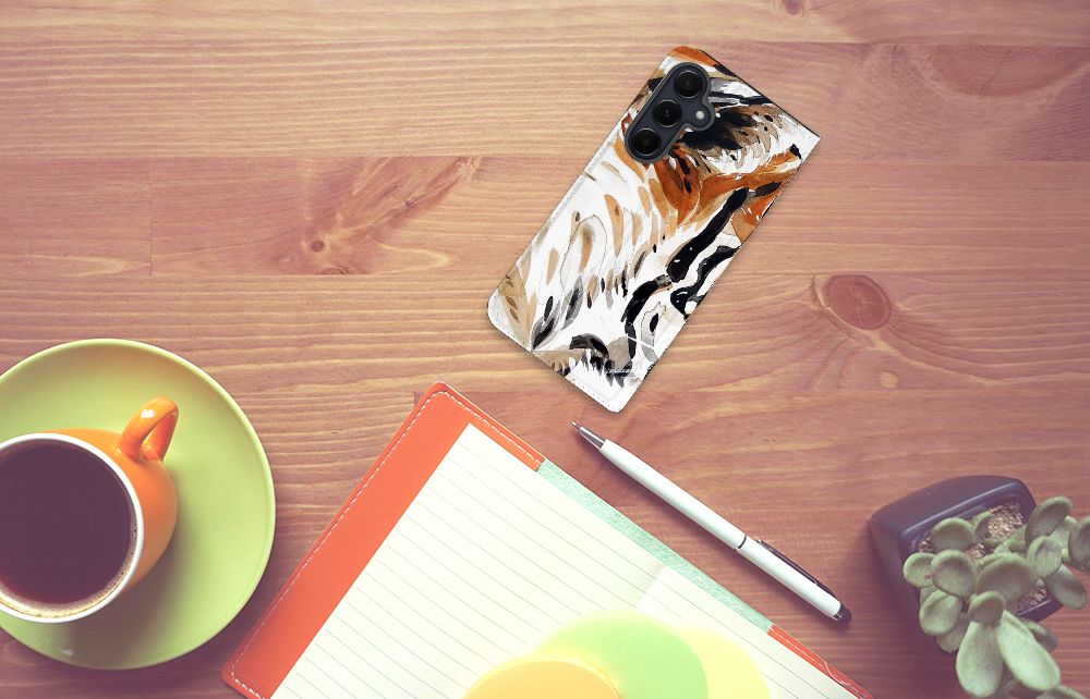 Omdat we tijgers zo bijzonder vinden, hebben we besloten deze voor zeer lage kosten voor jou op een Samsung Galaxy A55 Bookcase te zetten. Dit kunnen we goedkoop doen omdat we het drukwerk in eigen beheer doen. De tijger staat geschilderd op de stand case tegen een grijs met wit geblokte achtergrond. De Watercolor Tiger kunnen we bedrukken op verschillende soorten hoesjes, zoals deze stand cases. Het hoesje met geschilderde tijger tegen grijs met witte achtergrond is van PU-leer (buitenzijde) en TPU (binnenzijde) en beschikt een houder voor bijvoorbeeld je bankpas. Verder is de stand case met geschilderde tijger voorzien van een magnetische sluiting aan de binnenzijde. Jij zorgt voor de perfecte bescherming van je smartphone met dit stand hoesje met geschilderde tijger tegen een grijs met witte achtergrond.