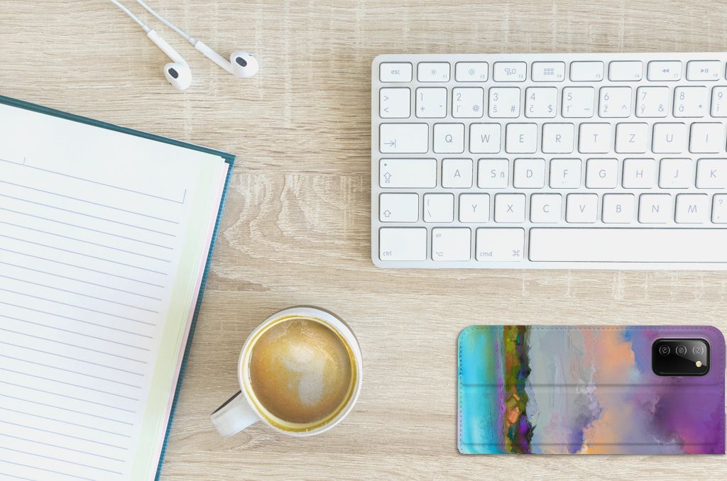 Het mooie ontwerp op dit hoesje zou je zo aan de muur willen hangen. Dit abstracte ‘schilderij’ van een bootje op een meer valt op vanwege de prachtige tinten blauw en paars. Een prachtig hoesje voor de liefhebber van kunst, boten en landschappen. Met een Bookcase is je Samsung Galaxy M02s | A02s goed beschermd. Dit populaire smartphonehoesje heeft één vakje voor een pasje of briefgeld en is aan alle zijden bedrukt. Met de standcase zet je je telefoon gemakkelijk neer, zodat je je handen vrij hebt als je bijvoorbeeld een video wilt kijken. De binnenkant van de standcase is van grijs PU-leer. Dat is fijn, omdat je daardoor niet snel vlekken ziet op je hoesje.
