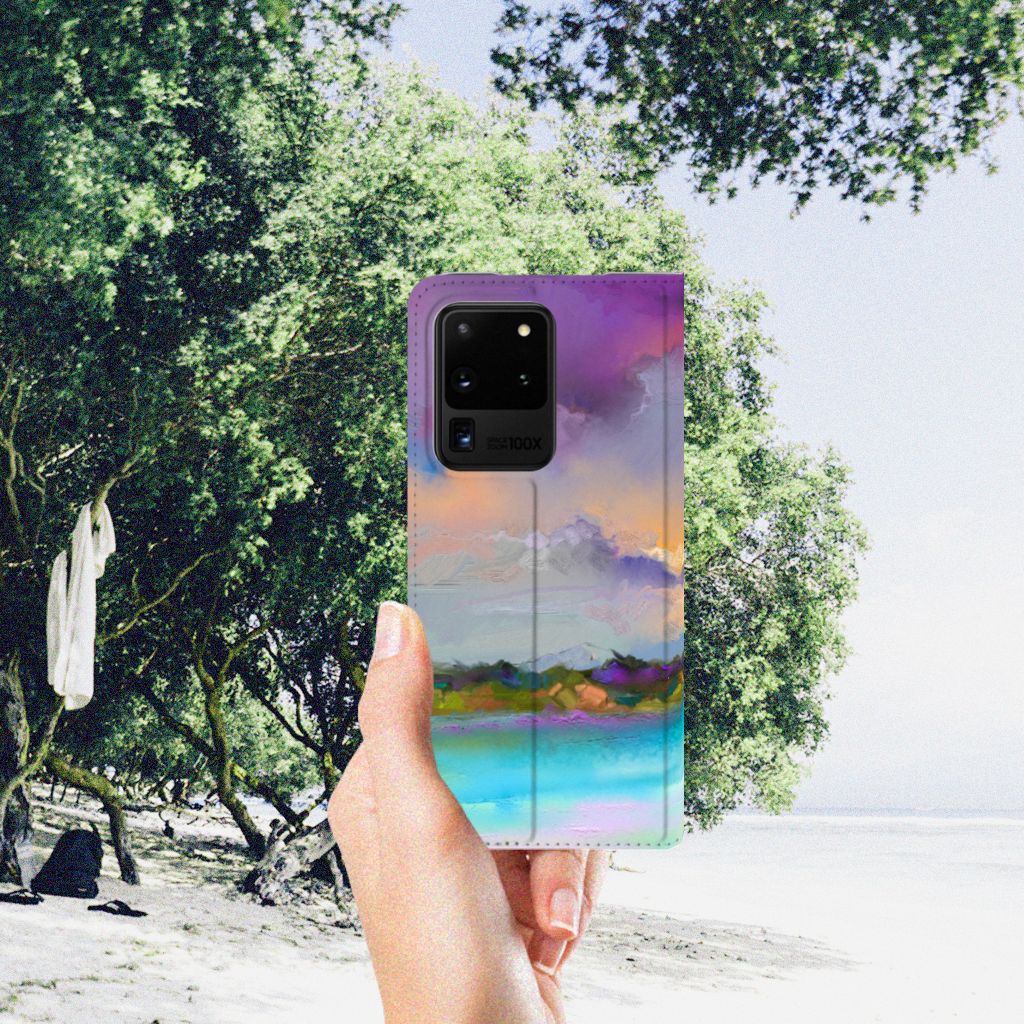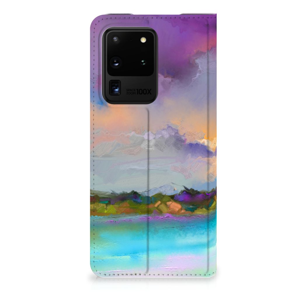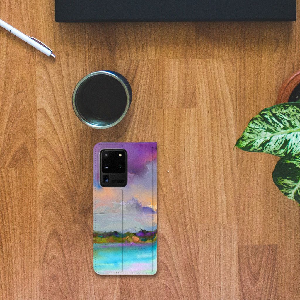 Het mooie ontwerp op dit hoesje zou je zo aan de muur willen hangen. Dit abstracte ‘schilderij’ van een bootje op een meer valt op vanwege de prachtige tinten blauw en paars. Een prachtig hoesje voor de liefhebber van kunst, boten en landschappen. Met een Bookcase is je Samsung Galaxy S20 Ultra goed beschermd. Dit populaire smartphonehoesje heeft één vakje voor een pasje of briefgeld en is aan alle zijden bedrukt. Met de standcase zet je je telefoon gemakkelijk neer, zodat je je handen vrij hebt als je bijvoorbeeld een video wilt kijken. De binnenkant van de standcase is van grijs PU-leer. Dat is fijn, omdat je daardoor niet snel vlekken ziet op je hoesje.