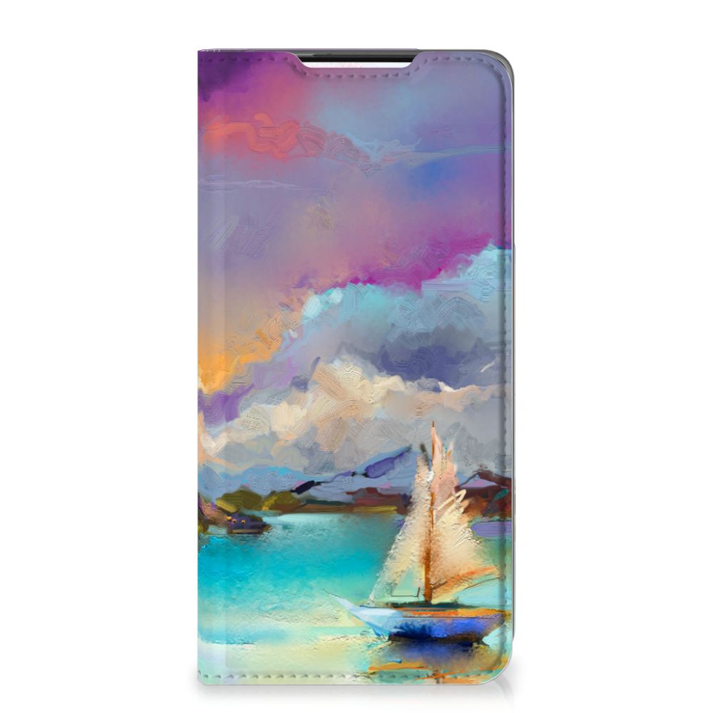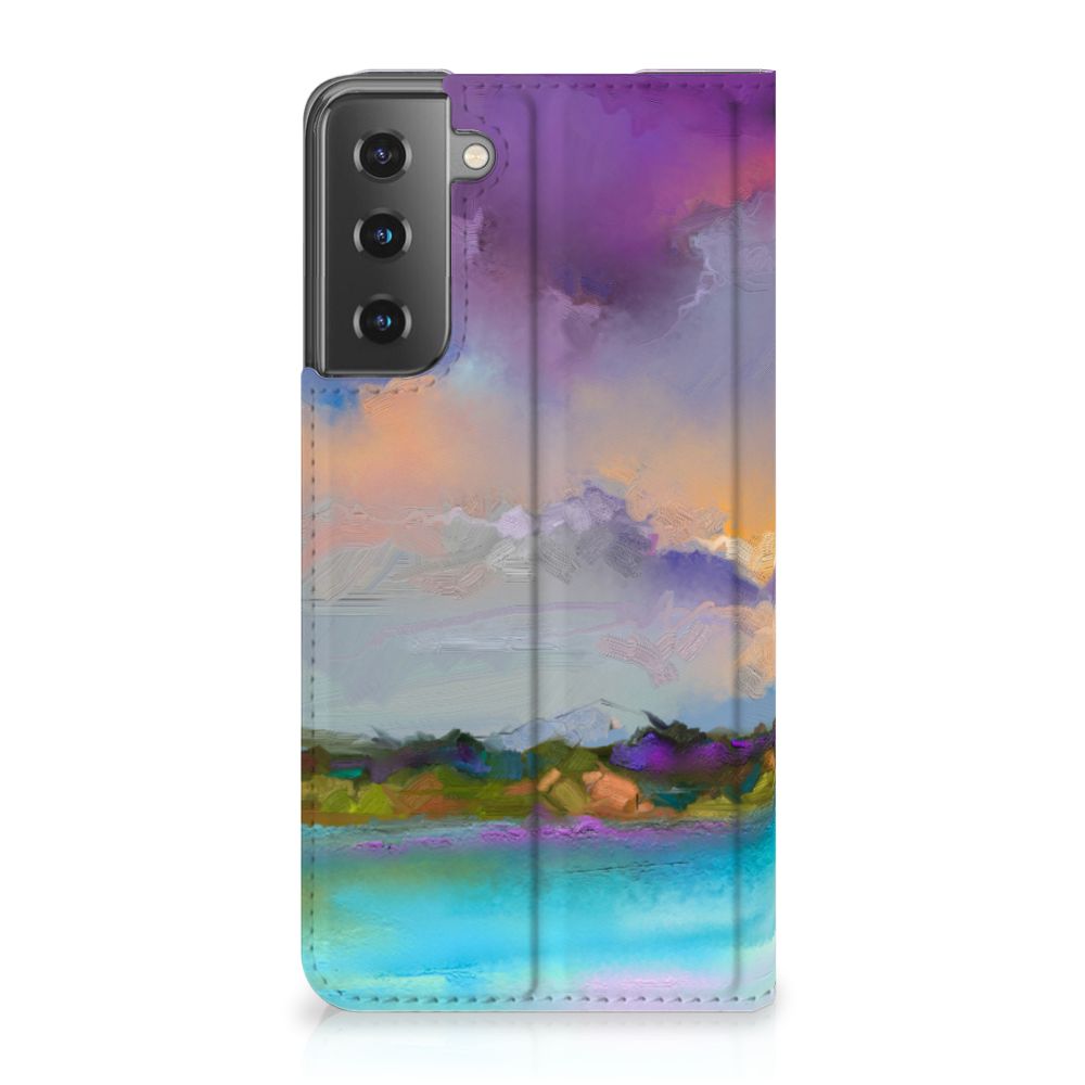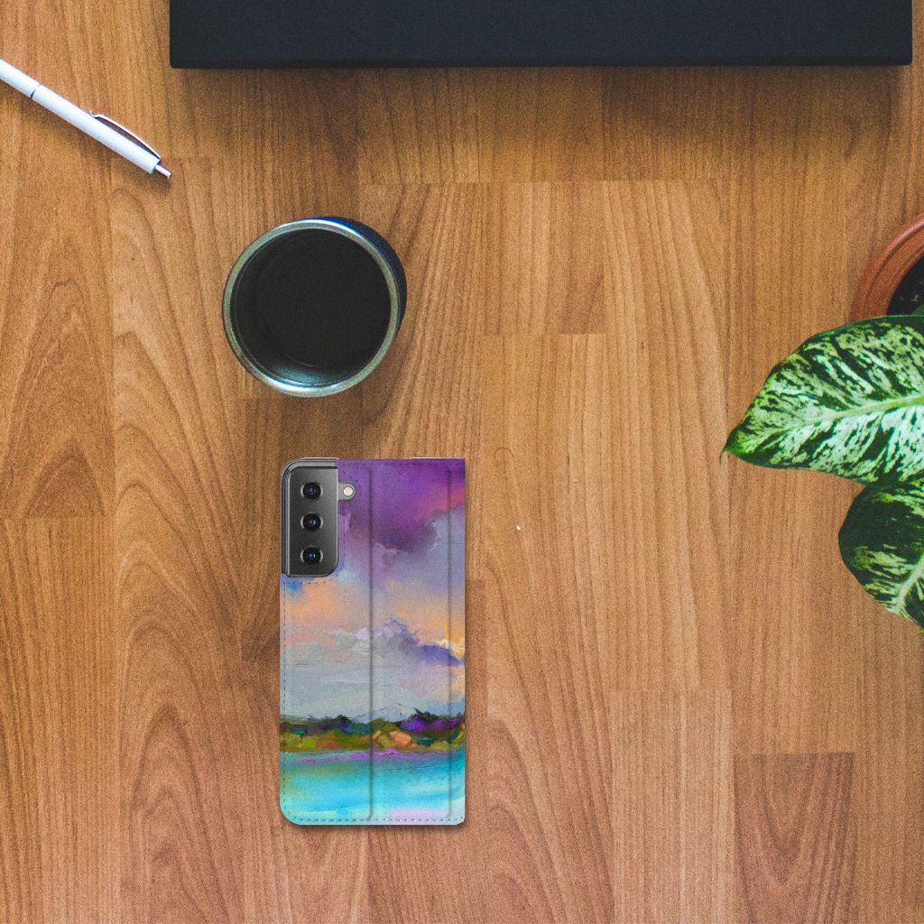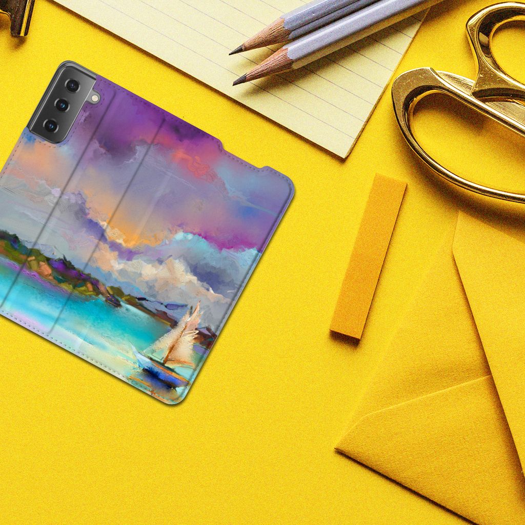 Het mooie ontwerp op dit hoesje zou je zo aan de muur willen hangen. Dit abstracte ‘schilderij’ van een bootje op een meer valt op vanwege de prachtige tinten blauw en paars. Een prachtig hoesje voor de liefhebber van kunst, boten en landschappen. Met een Bookcase is je Samsung Galaxy S21 goed beschermd. Dit populaire smartphonehoesje heeft één vakje voor een pasje of briefgeld en is aan alle zijden bedrukt. Met de standcase zet je je telefoon gemakkelijk neer, zodat je je handen vrij hebt als je bijvoorbeeld een video wilt kijken. De binnenkant van de standcase is van grijs PU-leer. Dat is fijn, omdat je daardoor niet snel vlekken ziet op je hoesje.