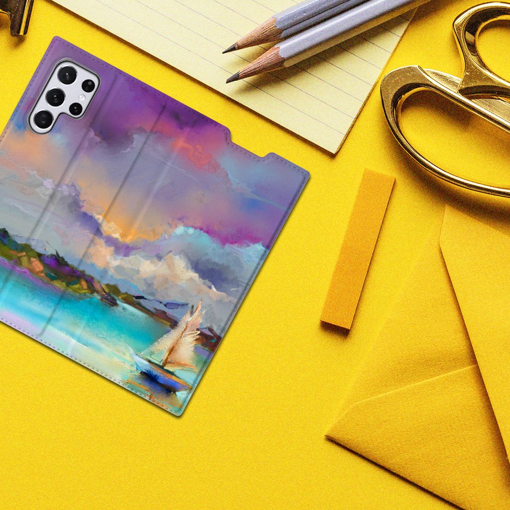 Het mooie ontwerp op dit hoesje zou je zo aan de muur willen hangen. Dit abstracte ‘schilderij’ van een bootje op een meer valt op vanwege de prachtige tinten blauw en paars. Een prachtig hoesje voor de liefhebber van kunst, boten en landschappen. Met een Bookcase is je Samsung Galaxy S22 Ultra goed beschermd. Dit populaire smartphonehoesje heeft één vakje voor een pasje of briefgeld en is aan alle zijden bedrukt. Met de standcase zet je je telefoon gemakkelijk neer, zodat je je handen vrij hebt als je bijvoorbeeld een video wilt kijken. De binnenkant van de standcase is van grijs PU-leer. Dat is fijn, omdat je daardoor niet snel vlekken ziet op je hoesje.