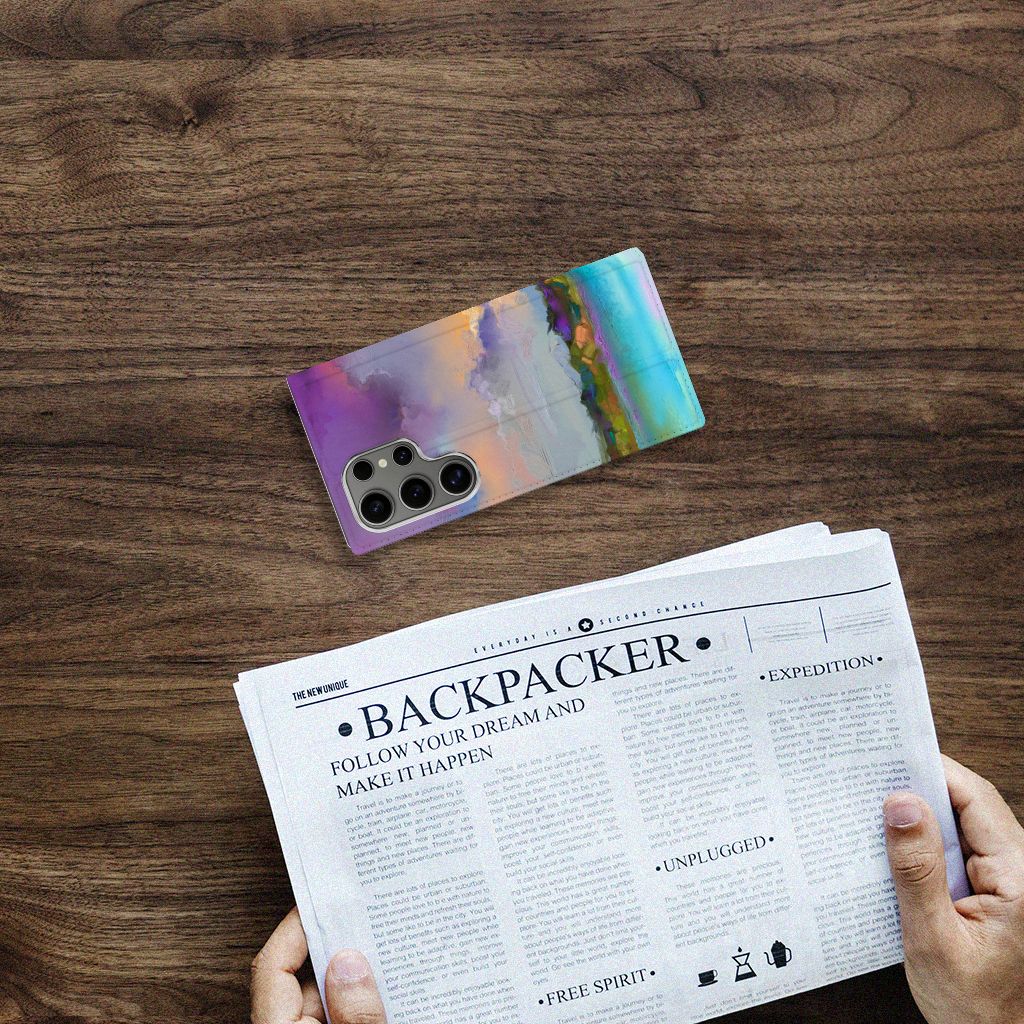 Het mooie ontwerp op dit hoesje zou je zo aan de muur willen hangen. Dit abstracte ‘schilderij’ van een bootje op een meer valt op vanwege de prachtige tinten blauw en paars. Een prachtig hoesje voor de liefhebber van kunst, boten en landschappen. Met een Bookcase is je Samsung Galaxy S24 Ultra goed beschermd. Dit populaire smartphonehoesje heeft één vakje voor een pasje of briefgeld en is aan alle zijden bedrukt. Met de standcase zet je je telefoon gemakkelijk neer, zodat je je handen vrij hebt als je bijvoorbeeld een video wilt kijken. De binnenkant van de standcase is van grijs PU-leer. Dat is fijn, omdat je daardoor niet snel vlekken ziet op je hoesje.
