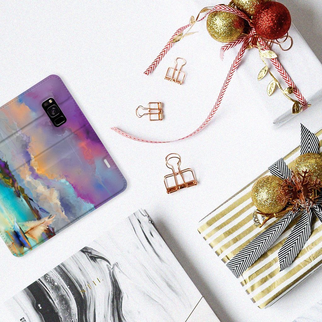 Het mooie ontwerp op dit hoesje zou je zo aan de muur willen hangen. Dit abstracte ‘schilderij’ van een bootje op een meer valt op vanwege de prachtige tinten blauw en paars. Een prachtig hoesje voor de liefhebber van kunst, boten en landschappen. Met een Bookcase is je Samsung Galaxy S8 goed beschermd. Dit populaire smartphonehoesje heeft één vakje voor een pasje of briefgeld en is aan alle zijden bedrukt. Met de standcase zet je je telefoon gemakkelijk neer, zodat je je handen vrij hebt als je bijvoorbeeld een video wilt kijken. De binnenkant van de standcase is van grijs PU-leer. Dat is fijn, omdat je daardoor niet snel vlekken ziet op je hoesje.