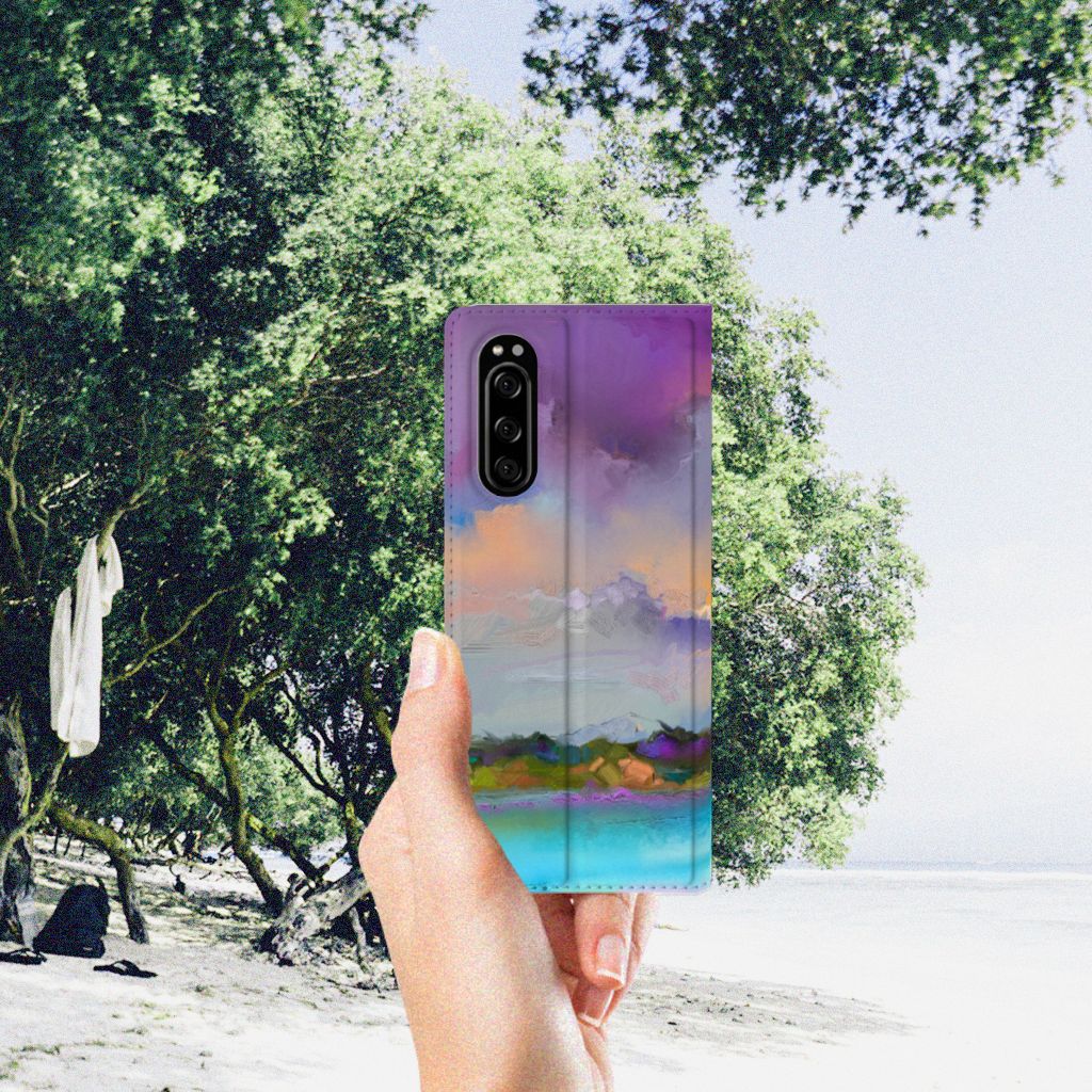 Het mooie ontwerp op dit hoesje zou je zo aan de muur willen hangen. Dit abstracte ‘schilderij’ van een bootje op een meer valt op vanwege de prachtige tinten blauw en paars. Een prachtig hoesje voor de liefhebber van kunst, boten en landschappen. Met een Bookcase is je Sony Xperia 5 goed beschermd. Dit populaire smartphonehoesje heeft één vakje voor een pasje of briefgeld en is aan alle zijden bedrukt. Met de standcase zet je je telefoon gemakkelijk neer, zodat je je handen vrij hebt als je bijvoorbeeld een video wilt kijken. De binnenkant van de standcase is van grijs PU-leer. Dat is fijn, omdat je daardoor niet snel vlekken ziet op je hoesje.
