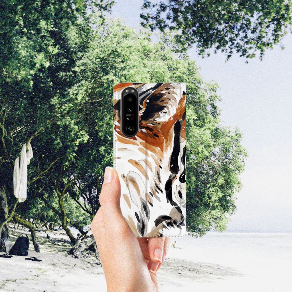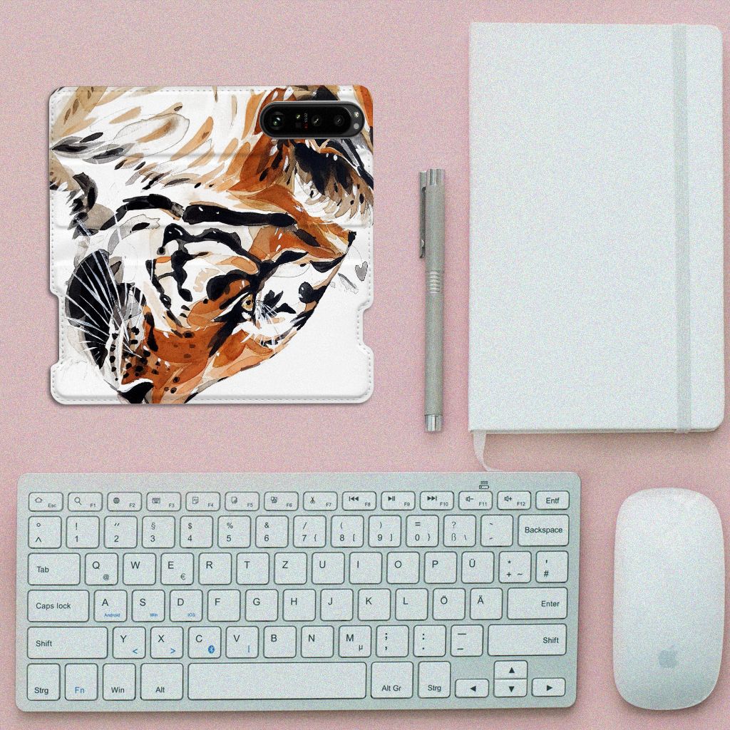 Omdat we tijgers zo bijzonder vinden, hebben we besloten deze voor zeer lage kosten voor jou op een Sony Xperia 5 III Bookcase te zetten. Dit kunnen we goedkoop doen omdat we het drukwerk in eigen beheer doen. De tijger staat geschilderd op de stand case tegen een grijs met wit geblokte achtergrond. De Watercolor Tiger kunnen we bedrukken op verschillende soorten hoesjes, zoals deze stand cases. Het hoesje met geschilderde tijger tegen grijs met witte achtergrond is van PU-leer (buitenzijde) en TPU (binnenzijde) en beschikt een houder voor bijvoorbeeld je bankpas. Verder is de stand case met geschilderde tijger voorzien van een magnetische sluiting aan de binnenzijde. Jij zorgt voor de perfecte bescherming van je smartphone met dit stand hoesje met geschilderde tijger tegen een grijs met witte achtergrond.