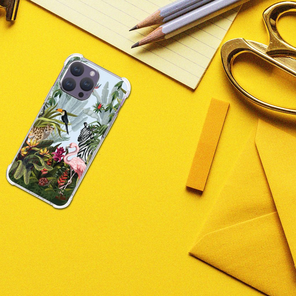 Ben je op zoek naar een tropische verrassing voor je iPhone 15 Pro Max? Dan is dit hoesje in jungle stijl zeker iets voor jou! Met de verschillende soorten dieren waan je je even in de Jungle, vind je ook niet? Dit design wordt geprint op een Case Anti-shock. Het ligt prettig in de hand en is licht van gewicht. Ook fijn zijn de extra dikke hoeken en randen, waardoor je iPhone 15 Pro Max goed beschermd is bij een val. Alleen de achterkant van je telefoon wordt beschermd. Daarom adviseren wij om dit hoesje in combinatie met een screenprotector te gebruiken. Bestel vandaag nog met dit telefoonhoesje met stoere jungle design!