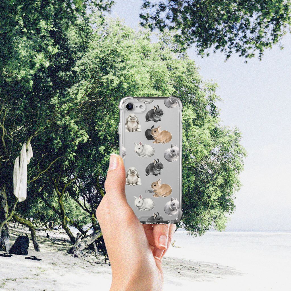 Wist je dat er wel 50 verschillende konijnenrassen zijn die zich onderscheiden in kleur, vacht, bouw en formaat? Daarom kon dit design met konijntjes eigenlijk niet ontbreken in onze collectie hoesjes. Wij zijn in ieder geval helemaal verliefd op deze schattige konijntjes. Dit design wordt geprint op een Case Anti-shock speciaal op maat gemaakt voor de iPhone SE 2022/2020 | iPhone 8/7. Ook fijn zijn de extra dikke hoeken en randen, waardoor je smartphone goed beschermd is bij een val. Alleen de achterkant van je telefoon wordt beschermd. Daarom adviseren wij om dit hoesje in combinatie met een screenprotector te gebruiken. Bestel vandaag nog dit telefoonhoesje met super schattige konijntjes!