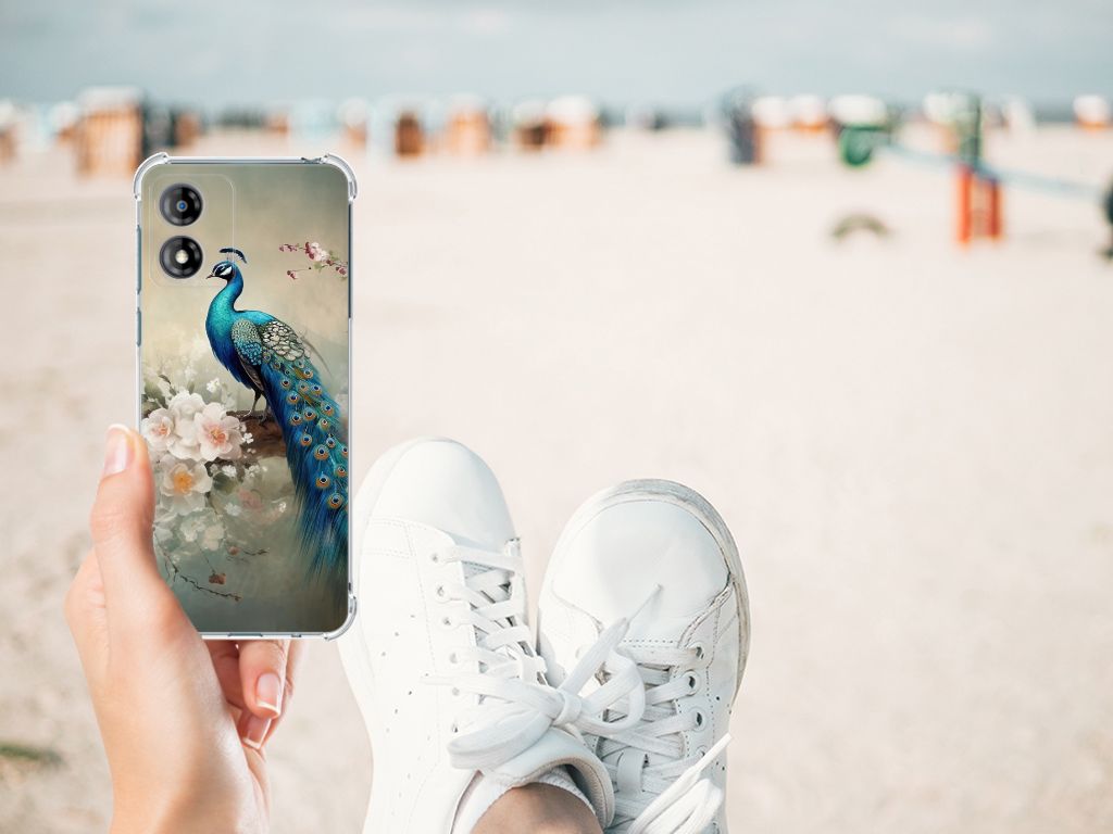 Wist je dat de sleep van pauwen bestaat uit wel 150 kleurige veren? Als de haan zijn sleep opzet om een vrouwtje te veroveren dan zie je deze veren het duidelijkst. Er zijn mensen die geloven dat een pauwenveer geluk brengt! Daarom mag dit romantische vintage pauwen design zeker niet ontbreken in onze collectie. Het blijven toch echt prachtige en fascinerende dieren om te zien! Dit design wordt geprint op een Case Anti-shock speciaal op maat gemaakt voor de Motorola Moto E13. Ook fijn zijn de extra dikke hoeken en randen, waardoor je smartphone goed beschermd is bij een val. Alleen de achterkant van je telefoon wordt beschermd. Daarom adviseren wij om dit hoesje in combinatie met een screenprotector te gebruiken. Bestel vandaag nog met dit telefoonhoesje met romantische vintage pauwen design!