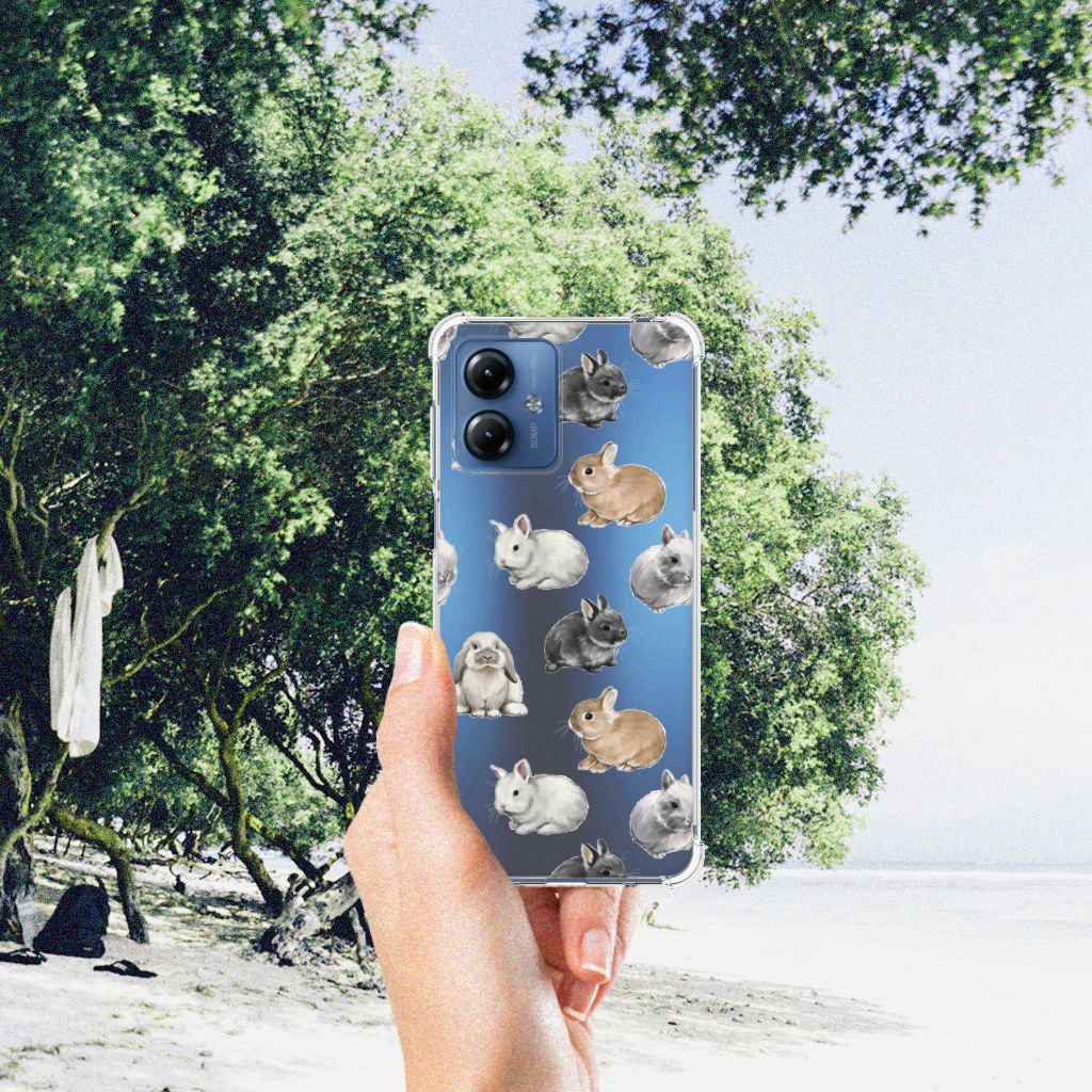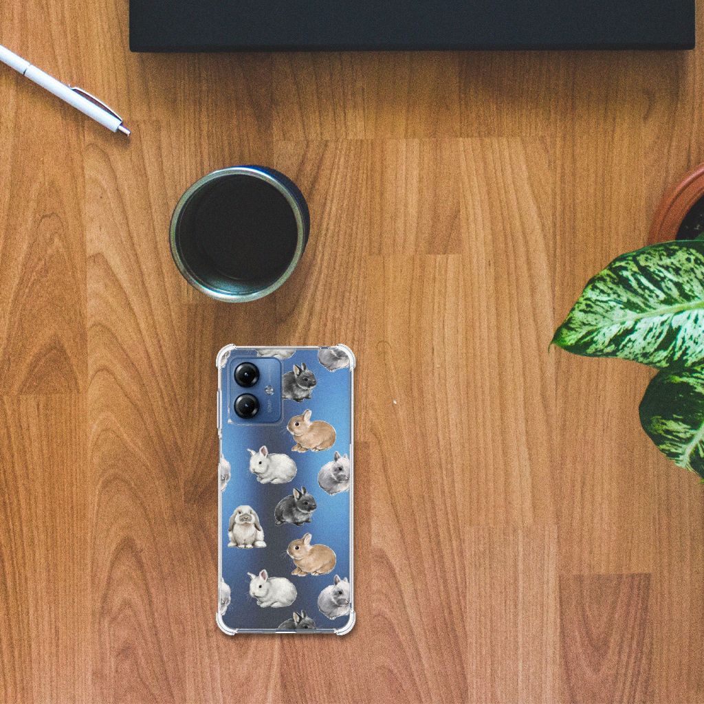 Wist je dat er wel 50 verschillende konijnenrassen zijn die zich onderscheiden in kleur, vacht, bouw en formaat? Daarom kon dit design met konijntjes eigenlijk niet ontbreken in onze collectie hoesjes. Wij zijn in ieder geval helemaal verliefd op deze schattige konijntjes. Dit design wordt geprint op een Case Anti-shock speciaal op maat gemaakt voor de Motorola Moto G14. Ook fijn zijn de extra dikke hoeken en randen, waardoor je smartphone goed beschermd is bij een val. Alleen de achterkant van je telefoon wordt beschermd. Daarom adviseren wij om dit hoesje in combinatie met een screenprotector te gebruiken. Bestel vandaag nog dit telefoonhoesje met super schattige konijntjes!