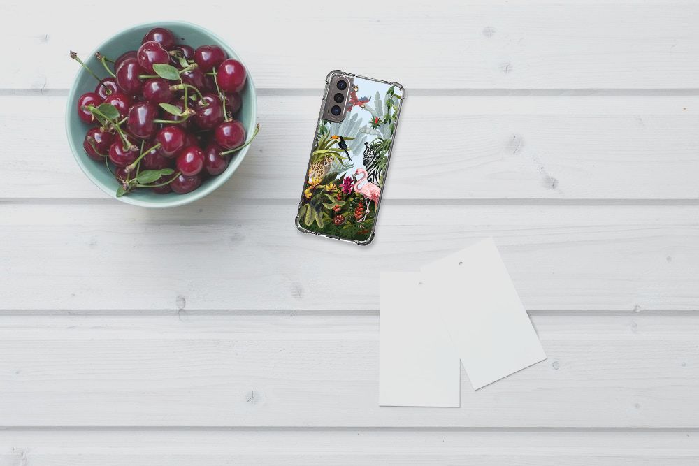 Ben je op zoek naar een tropische verrassing voor je Samsung Galaxy S21? Dan is dit hoesje in jungle stijl zeker iets voor jou! Met de verschillende soorten dieren waan je je even in de Jungle, vind je ook niet? Dit design wordt geprint op een Case Anti-shock. Het ligt prettig in de hand en is licht van gewicht. Ook fijn zijn de extra dikke hoeken en randen, waardoor je Samsung Galaxy S21 goed beschermd is bij een val. Alleen de achterkant van je telefoon wordt beschermd. Daarom adviseren wij om dit hoesje in combinatie met een screenprotector te gebruiken. Bestel vandaag nog met dit telefoonhoesje met stoere jungle design!
