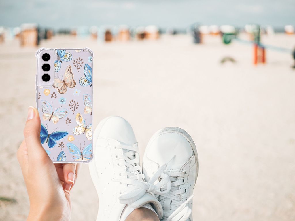 Wist je dat vlinders symbool staan voor geluk, vrijheid en liefde? Veel mensen worden daarom vrolijk als ze een vlinder voorbij zien fladderen. Hoe leuk is het dan om dit vlinder design op jouw Samsung Galaxy S22 te hebben? Zo wordt jij zeker vrolijk bij het zien van je telefoon. Dit vlinder design wordt geprint op een Case Anti-shock. Het ligt prettig in de hand en is licht van gewicht. Ook fijn zijn de extra dikke hoeken en randen, waardoor je Samsung Galaxy S22 goed beschermd is bij een val. Alleen de achterkant van je telefoon wordt beschermd. Daarom adviseren wij om dit hoesje in combinatie met een screenprotector te gebruiken. Bestel vandaag nog dit telefoonhoesje met vrolijke vlinder design!