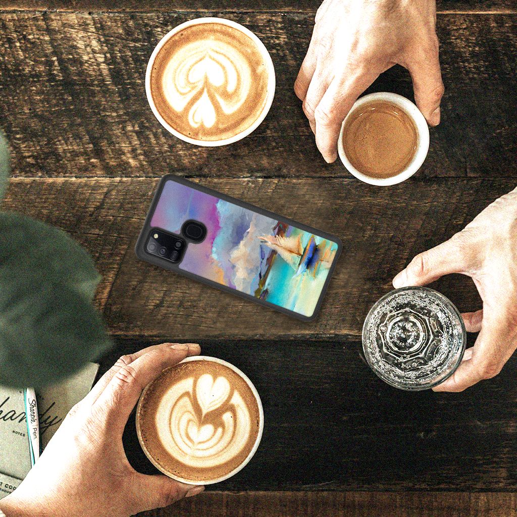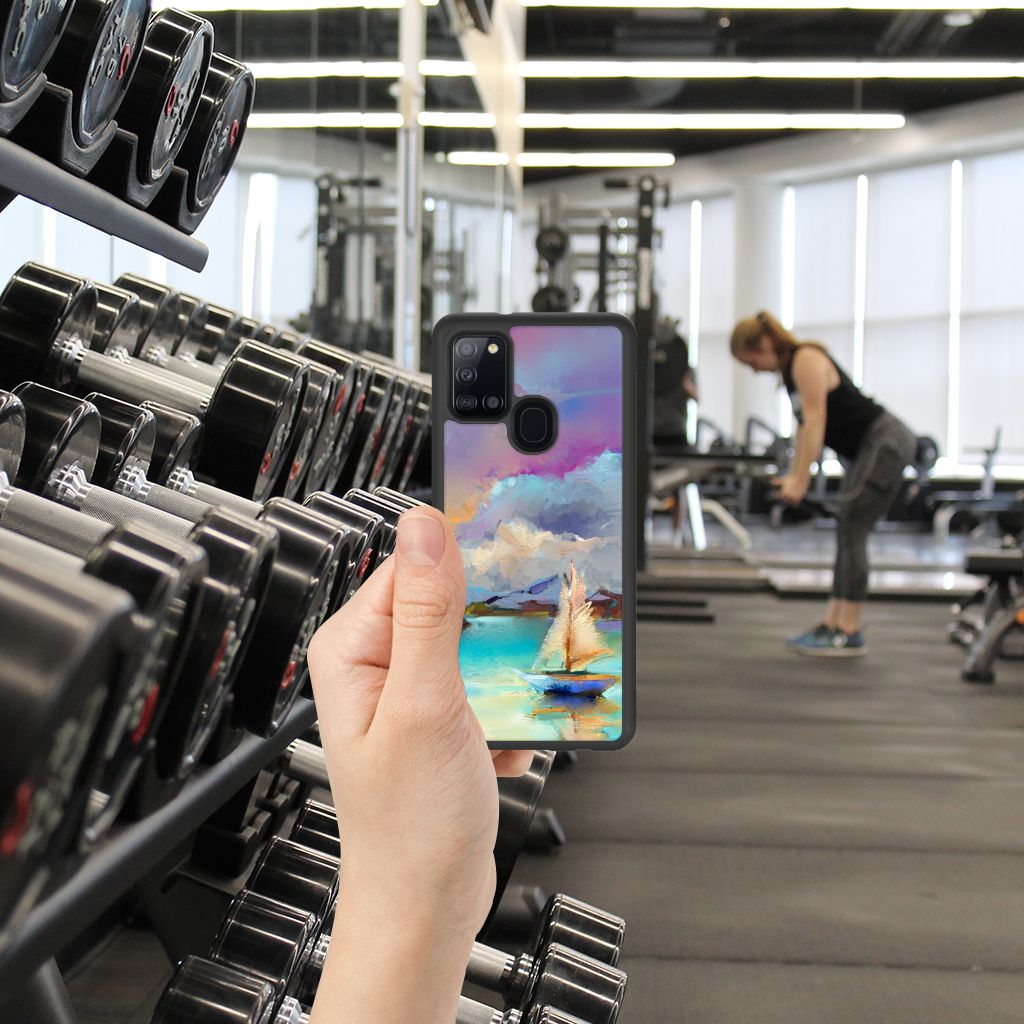 Het mooie ontwerp op dit hoesje zou je zo aan de muur willen hangen. Dit abstracte ‘schilderij’ van een bootje op een meer valt op vanwege de prachtige tinten blauw en paars. Een prachtig hoesje voor de liefhebber van kunst, boten en landschappen. Met een Case is je Samsung Galaxy A21s goed beschermd. Een gripcase is voor mensen die van stevigheid houden. Je moet het zien als een mix van een hardcase en een TPU hoesje. De achterkant is van een stevig materiaal gemaakt, dat wordt bedrukt met het design. De zijkanten hebben een subtiele en mooie textuur, voor meer grip.