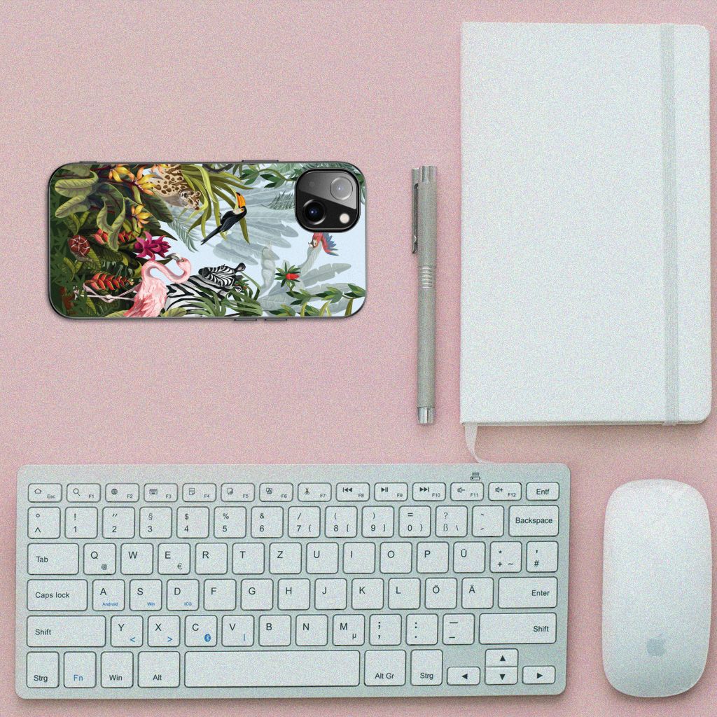 Ben je op zoek naar een tropische verrassing voor je iPhone 14 Plus? Dan is dit hoesje in jungle stijl zeker iets voor jou! Met de verschillende soorten dieren waan je je even in de jungle, vind je ook niet? Dit design wordt geprint op een Dierenprint Telefoonhoesje. Het ligt prettig in de hand en is licht van gewicht. Het is een mix van hardcase en TPU. Deze combinatie samen zorgt wat ons betreft voor een perfect hoesje als je van niet te veel poespas houdt. Alleen de achterkant van je telefoon wordt beschermd. Daarom adviseren wij om dit hoesje in combinatie met een screenprotector te gebruiken. Bestel vandaag nog dit toffe smartphonehoesje met stoere jungle design!