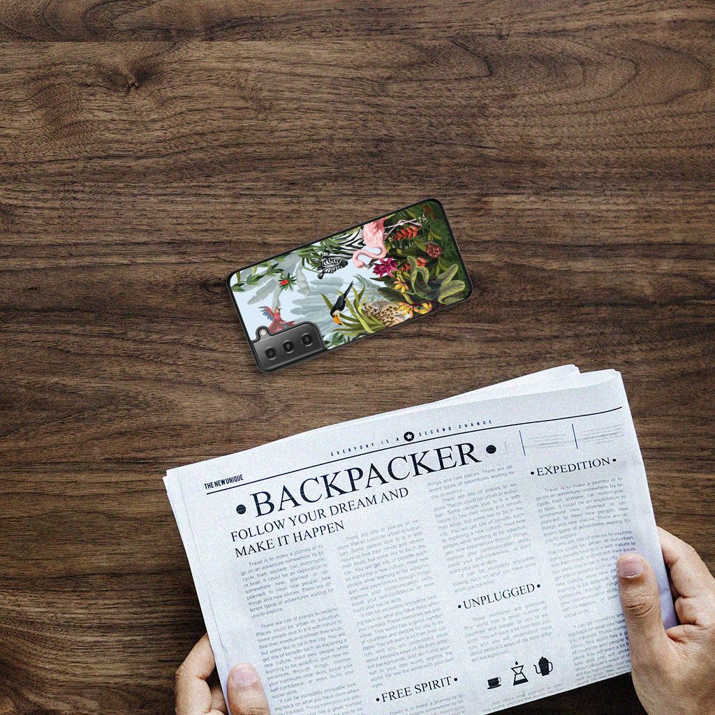 Ben je op zoek naar een tropische verrassing voor je Samsung Galaxy S21? Dan is dit hoesje in jungle stijl zeker iets voor jou! Met de verschillende soorten dieren waan je je even in de jungle, vind je ook niet? Dit design wordt geprint op een Dierenprint Telefoonhoesje. Het ligt prettig in de hand en is licht van gewicht. Het is een mix van hardcase en TPU. Deze combinatie samen zorgt wat ons betreft voor een perfect hoesje als je van niet te veel poespas houdt. Alleen de achterkant van je telefoon wordt beschermd. Daarom adviseren wij om dit hoesje in combinatie met een screenprotector te gebruiken. Bestel vandaag nog dit toffe smartphonehoesje met stoere jungle design!