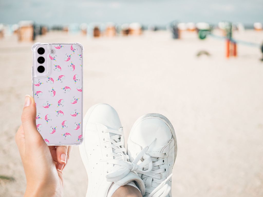 Vind jij unicorns ook zo leuk? Dan hebben wij het perfecte hoesje voor jouw Samsung Galaxy S22! Met deze schattige unicorns heb jij gegarandeerd iets unieks in handen. Dit Doorzichtige Silicone Hoesje ligt prettig in de hand en is licht van gewicht. Ook fijn zijn de extra dikke hoeken en randen, waardoor je Samsung Galaxy S22 goed beschermd is bij een val. Alleen de achterkant van je telefoon wordt beschermd. Daarom adviseren wij om dit hoesje in combinatie met een screenprotector te gebruiken. Het unicorn design wordt alleen geprint en de achtergrond blijft transparant. Hierdoor zie je altijd de kleur van je smartphone. Hoe leuk is dat? Bescherm jouw telefoon vandaag nog met dit unicorn hoesje!