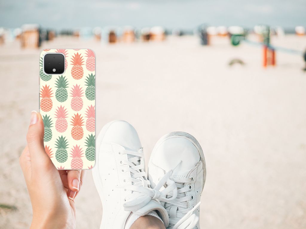 Ananas is een woord uit het Tupi, de taal van de Tupi-indianen, en betekent uitmuntende vrucht. Dit fruit van zeer hoge kwaliteit staat op onze superieure boekhoesjes, stand cases, hard cases en TPU cases. Jij blijft er gezond uitzien als je zo nu en dan een hap neemt van een Ananas , jouw smartphone blijft tip top in orde als je er een leuk telefoonhoesje omheen doet. Een ananas heeft stevig, veerkrachtig vruchtvlees. Een beetje te vergelijken met het TPU in onze hoesjes. TPU is elastisch materiaal, dat zeer buigzaam is. Vandaar dat het zeer schokbestendig is. Het ananas design staat op een staat op een TPU case. Deze Google Pixel 4 Siliconen Case wordt alleen aan de bovenkant bedrukt en is zeer flexibel. De randen van het hoesje blijven transparant.