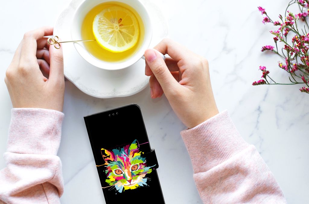 Als jij van katten houdt en op zoek bent naar een uniek hoesje, dan is dit het hoesje wat je wilt hebben. Op de voorkant van dit Leuk Hoesje vind je namelijk een mooie afbeelding van een kat in alle kleuren van de regenboog op een zwarte klassieke achtergrond. Naast dat het een mooi hoesje betreft, is het ook nog eens ontzettend handig. Zo kun je in deze bookcase wel twee á drie pasjes en briefgeld kwijt. Hiermee kun je jouw belangrijkste bezittingen op een plek bewaren in het boekhoesje en kun je jouw portemonnee voortaan thuislaten. Een bookcase heeft daarnaast ook nog het voordeel dat jouw telefoon aan alle zijdes wordt beschermd in dit leuke hoesje, dubbel zo handig dus!