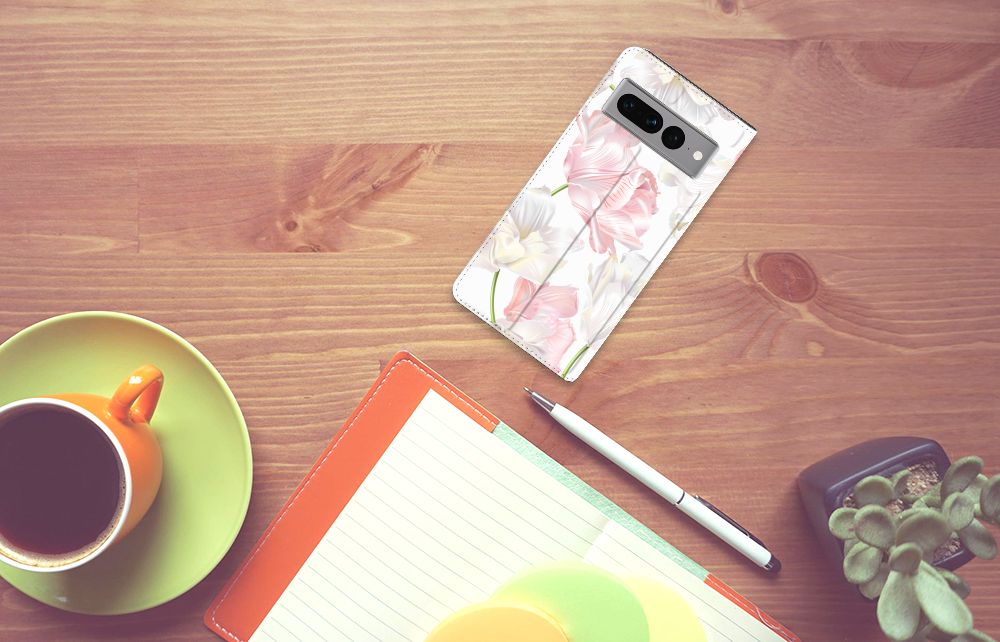 Een bosje bloemen doet een mens (en zijn smartphone) goed. De witte en roze bloemen op dit Google Pixel 7 Pro Smart Cover geven jouw smartphone een zeer mooie uitstraling. Je wordt er ook meteen een stuk rustiger van als je aan het appen of aan het bellen bent. Valt dan je telefoon op de grond, dan zal er dankzij de stand case met het design Lovely Flowers ontstaan. Onze stand cases met roze en witte bloemen zien er zeer prettig uit en zijn heel praktisch, wat blijkt uit onder meer het vakje aan de binnenkant en de handige standaard waarmee je de smartphone rechtop op tafel neer kunt zetten. De roze en witte bloemen passen goed op alle zijden van de case. Op deze stand case van leer en TPU (houder aan de binnenkant) kun je trouwens ook je eigen bloemige ontwerp zetten. In een paar simpele stappen maak je zelf een stand hoesje met daarop jouw mooiste bloemen.