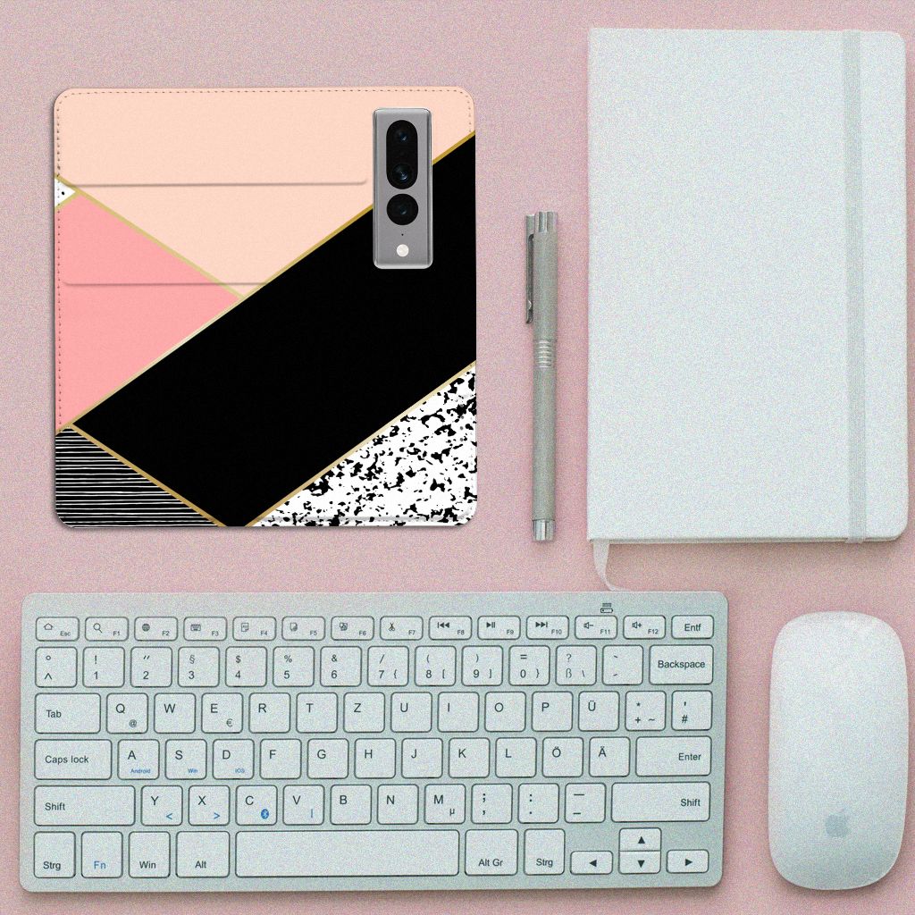 - Met een hoesje met roze, zwarte en witte vlakken op alle zijden blijft jouw telefoon in tact.