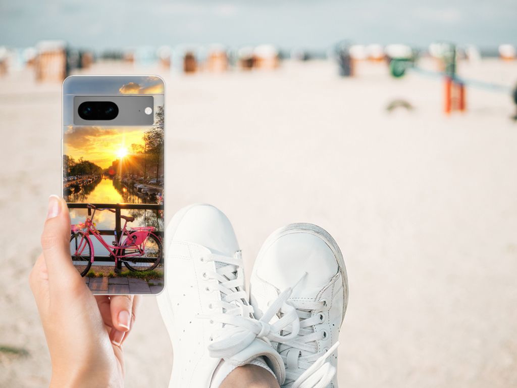 Amsterdam is meer dan ooit een toeristische trekpleister. Een bezoek aan de hoofdstad is niet compleet als je niet aanlegt bij de Amsterdamse Grachten. Ze zijn een symbool van de stad en hebben een enorme culturele en historische waarde. Daarom kunnen ze natuurlijk niet ontbreken in onze collectie design hoesjes. Dit schitterende design hoesje met Amsterdamse grachten tref je enkel en alleen aan bij B2C Telecom. De ondergaande zon en de fleurige en fraaie bloempakketten zorgen voor een prachtig totaalplaatje. Amsterdam is wereldberoemd om haar prachtige grachten uit de zeventiende eeuw. Dit smartphone hoesje is hier een eerbetoon aan. Het design staat op een TPU case. Dit Google Pixel 7 Siliconen Back Cover wordt alleen aan de bovenkant bedrukt en is zeer flexibel. De randen van het hoesje blijven transparant.