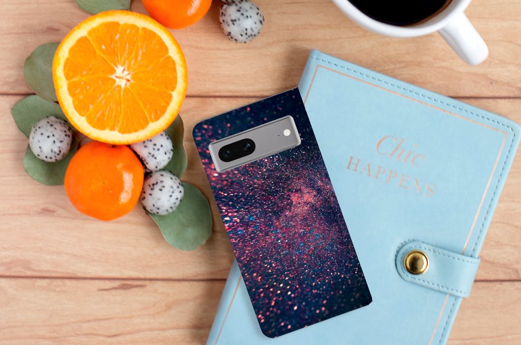 Je waant je in de zevende hemel met dit kunstzinnige, glitterachtige design hoesje met paarse en blauwe kleuren tegen een inktzwarte achtergrond. Het smartphone hoesje heeft ook een wat science fiction achtige allure. Met deze design Stars case zul je zeker opvallen. Als dit je bedoeling is, bestel dat snel dit waanzinnig mooie product voor je Google Pixel 7. Het telefoonhoesje is van alle gemakken voorzien en combineert een hele fraaie uitstraling met maximaal comfort. Bovendien is het gemaakt van zeer stevig en flexibel materiaal. Het unieke design, door B2C Telecom ontworpen, staat op een Stand Case. Deze case beschermt jouw telefoon aan alle kanten en beschikt over een 1 opbergvakje en een speciale standaard. Het hoesje wordt afgesloten met een magneet aan de binnenzijde. De houder aan de binnenzijde is van TPU.