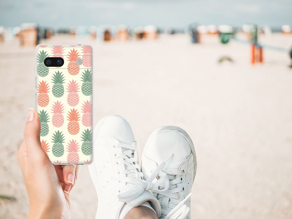 Ananas is een woord uit het Tupi, de taal van de Tupi-indianen, en betekent uitmuntende vrucht. Dit fruit van zeer hoge kwaliteit staat op onze superieure boekhoesjes, stand cases, hard cases en TPU cases. Jij blijft er gezond uitzien als je zo nu en dan een hap neemt van een Ananas , jouw smartphone blijft tip top in orde als je er een leuk telefoonhoesje omheen doet. Een ananas heeft stevig, veerkrachtig vruchtvlees. Een beetje te vergelijken met het TPU in onze hoesjes. TPU is elastisch materiaal, dat zeer buigzaam is. Vandaar dat het zeer schokbestendig is. Het ananas design staat op een staat op een TPU case. Deze Google Pixel 7A Siliconen Case wordt alleen aan de bovenkant bedrukt en is zeer flexibel. De randen van het hoesje blijven transparant.