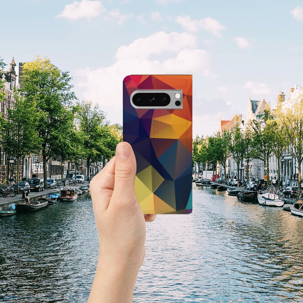 Veelkleurige driehoeken die samen eindeloze asymmetrische patronen lijken te vormen. Het is het abstracte schouwspel dat op dit fraaie hoesje voor je Google Pixel 8 Pro direct de aandacht trekt noemen we voor het gemak trekt noemen we voor het gemak Polygon Color. De een ziet er een berglandschap in, de ander piramides. Wat zie jij erin? Zeker is in elk geval dat de aanblik van dit fascinerende ontwerp je niet snel gaat vervelen. Het kleurige spel van lijnen en vlakken blijft eindeloos boeien en geeft jouw Stand Case een hippe en kunstzinnige uitstraling. De kracht die het lijnenspel uitstraalt, komt ook terug in het hoesje zelf. De solide hoes van PU-leer beschikt ook over een 1 pashouder en een speciale standaard. Het hoesje wordt afgesloten met een magneet aan de binnenzijde. De houder aan de binnenzijde is van TPU. Alle zijden worden bedrukt.