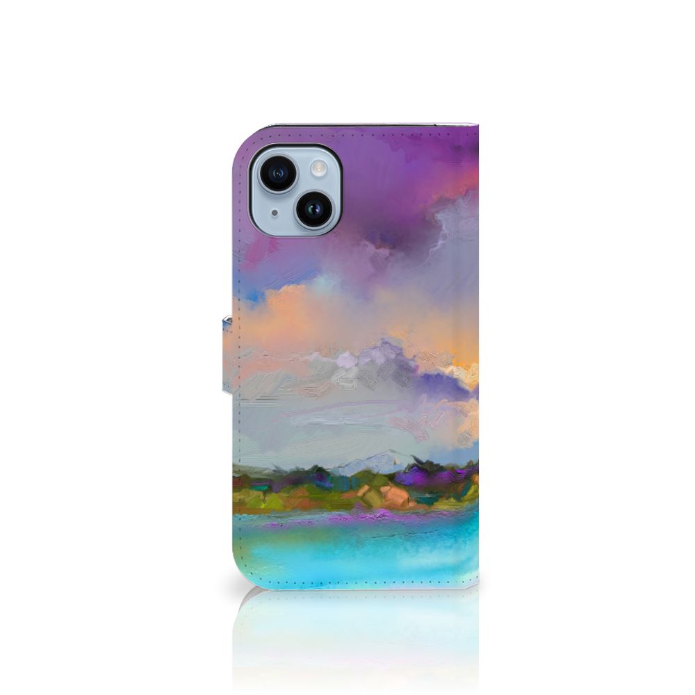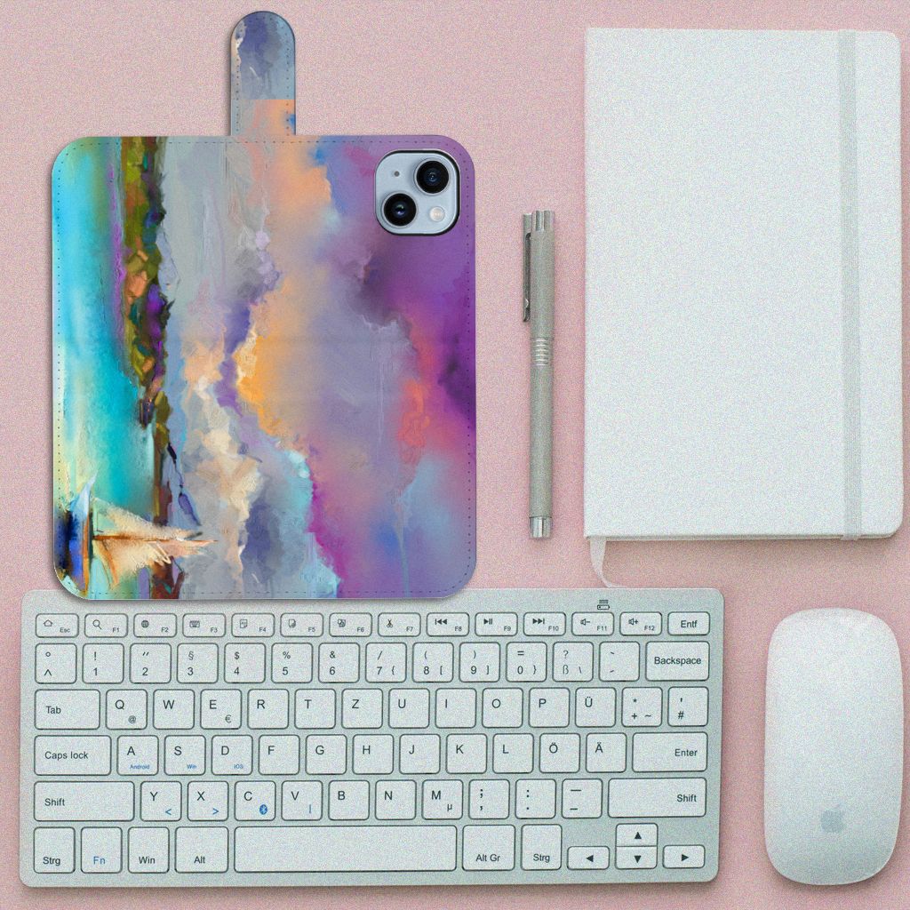 Het design op dit artistieke hoesje met de verschillende tinten van paars, blauw en groen zou je zo zelf op de muur kunnen hangen. Het design laat een boot zien maar dan is hij wat abstracter geverfd met door elkaar lopende kleuren. Als jij houdt van kunst dan is dit artistieke hoesje wat voor jou. Wat het ontwerp extra mooi maakt is dat de gehele bookcase is bedrukt inclusief het magnetische lipje wat als sluiting wordt gebruikt. Het andere voordeel van een bookcase is dat jouw telefoon aan alle kanten is beschermd, ook als je hem op zijn scherm laat vallen is er niks aan de hand en wordt jouw telefoon goed beschermd door het kunstleer wat eromheen zit. Het magnetische lipje zorgt er dan weer voor dat het iPhone 15 Plus Hoesje op zijn plek blijft zitten en dat jouw telefoon aan alle kanten beschermd blijft.