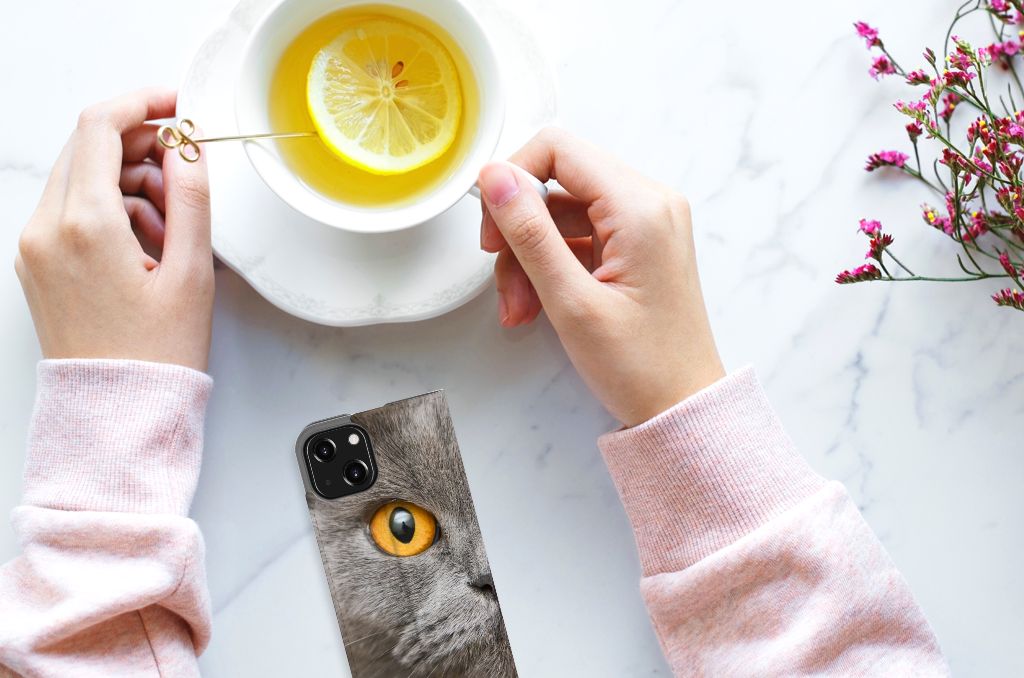 Dit hoesje met een afbeelding van de Brits Korthaar ziet er imponerend uit. Wellicht komt dat door de strakke blik van de Brits Korthaar, een stevige, gedrongen kat die aan het eind van de 19e eeuw in Engeland gefokt werd voor specifieke kleur en tekening in de vacht. De kleine oren en grote ronde ogen vallen op, alsmede de erg bolle wangen. Het is een grote en gespierde kat met een korte, dikke staart waarvan de top lichtjes afgerond is. Vroeger kwam het ras voornamelijk in de kleur blauw voor, maar op dit moderne hoesje staat natuurlijk de grijze versie afgebeeld. Het design staat op een iPhone 13 Mini Hoesje maken. Deze case beschermt jouw telefoon aan alle kanten en beschikt over een 1 opbergvakje en een speciale standaard. Het hoesje wordt afgesloten met een magneet aan de binnenzijde. De houder aan de binnenzijde is van TPU. Alle zijden van de stand case worden bedrukt.
