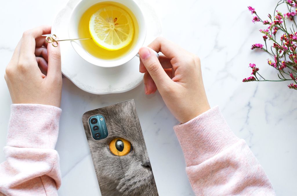 Dit hoesje met een afbeelding van de Brits Korthaar ziet er imponerend uit. Wellicht komt dat door de strakke blik van de Brits Korthaar, een stevige, gedrongen kat die aan het eind van de 19e eeuw in Engeland gefokt werd voor specifieke kleur en tekening in de vacht. De kleine oren en grote ronde ogen vallen op, alsmede de erg bolle wangen. Het is een grote en gespierde kat met een korte, dikke staart waarvan de top lichtjes afgerond is. Vroeger kwam het ras voornamelijk in de kleur blauw voor, maar op dit moderne hoesje staat natuurlijk de grijze versie afgebeeld. Het design staat op een Nokia G11 | G21 Hoesje maken. Deze case beschermt jouw telefoon aan alle kanten en beschikt over een 1 opbergvakje en een speciale standaard. Het hoesje wordt afgesloten met een magneet aan de binnenzijde. De houder aan de binnenzijde is van TPU. Alle zijden van de stand case worden bedrukt.