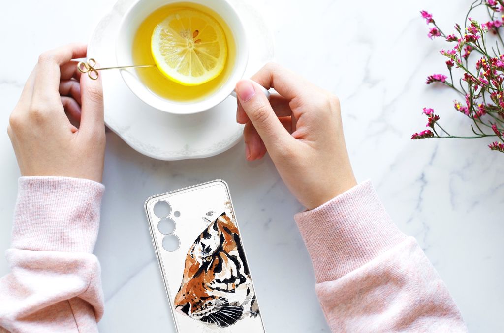 Omdat we tijgers zo bijzonder vinden, hebben we besloten deze voor zeer lage kosten voor jou op een Samsung Galaxy A54 5G Hoesje maken te zetten. Dit kunnen we goedkoop doen omdat we het drukwerk in eigen beheer doen. De tijger staat geschilderd op de tpu case tegen een grijs met wit geblokte achtergrond. De Watercolor Tiger kunnen we bedrukken op verschillende soorten hoesjes, zoals deze tpu cases. Deze case kan exclusief in het bezit van jou komen. Zeker als je er zelf nog unieke teksten en/of beelden aan toevoegt. Het tpu hoesje is zeer flexibel en wordt alleen aan de bovenzijde bedrukt met de tijger. De randen van dit flexibele hoesje blijven doorzichtig. Jij zorgt voor de perfecte bescherming van je smartphone met dit tpu hoesje met geschilderde tijger tegen een grijs met witte achtergrond.