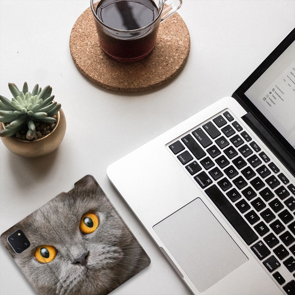 Dit hoesje met een afbeelding van de Brits Korthaar ziet er imponerend uit. Wellicht komt dat door de strakke blik van de Brits Korthaar, een stevige, gedrongen kat die aan het eind van de 19e eeuw in Engeland gefokt werd voor specifieke kleur en tekening in de vacht. De kleine oren en grote ronde ogen vallen op, alsmede de erg bolle wangen. Het is een grote en gespierde kat met een korte, dikke staart waarvan de top lichtjes afgerond is. Vroeger kwam het ras voornamelijk in de kleur blauw voor, maar op dit moderne hoesje staat natuurlijk de grijze versie afgebeeld. Het design staat op een Samsung Galaxy Note 10 Lite Hoesje maken. Deze case beschermt jouw telefoon aan alle kanten en beschikt over een 1 opbergvakje en een speciale standaard. Het hoesje wordt afgesloten met een magneet aan de binnenzijde. De houder aan de binnenzijde is van TPU. Alle zijden van de stand case worden bedrukt.