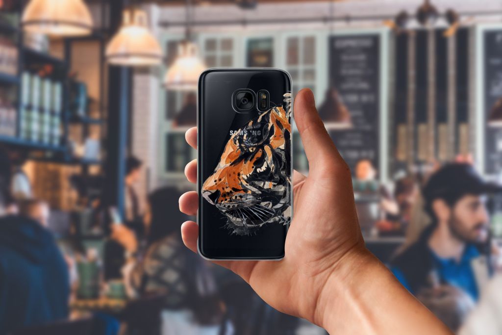 Omdat we tijgers zo bijzonder vinden, hebben we besloten deze voor zeer lage kosten voor jou op een Samsung Galaxy S7 Hoesje maken te zetten. Dit kunnen we goedkoop doen omdat we het drukwerk in eigen beheer doen. De tijger staat geschilderd op de tpu case tegen een grijs met wit geblokte achtergrond. De Watercolor Tiger kunnen we bedrukken op verschillende soorten hoesjes, zoals deze tpu cases. Deze case kan exclusief in het bezit van jou komen. Zeker als je er zelf nog unieke teksten en/of beelden aan toevoegt. Het tpu hoesje is zeer flexibel en wordt alleen aan de bovenzijde bedrukt met de tijger. De randen van dit flexibele hoesje blijven doorzichtig. Jij zorgt voor de perfecte bescherming van je smartphone met dit tpu hoesje met geschilderde tijger tegen een grijs met witte achtergrond.