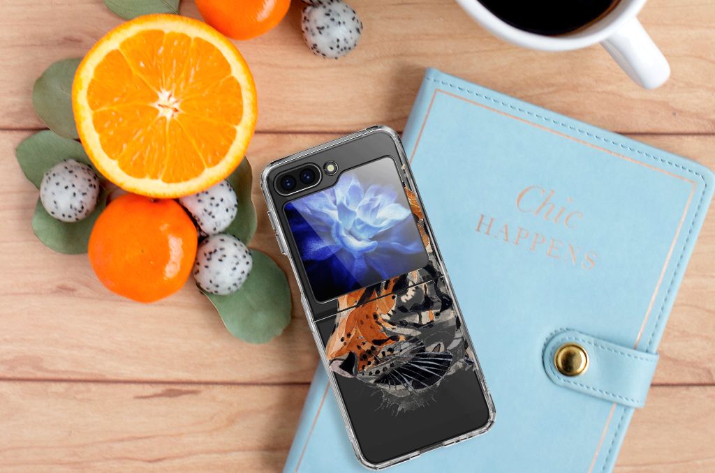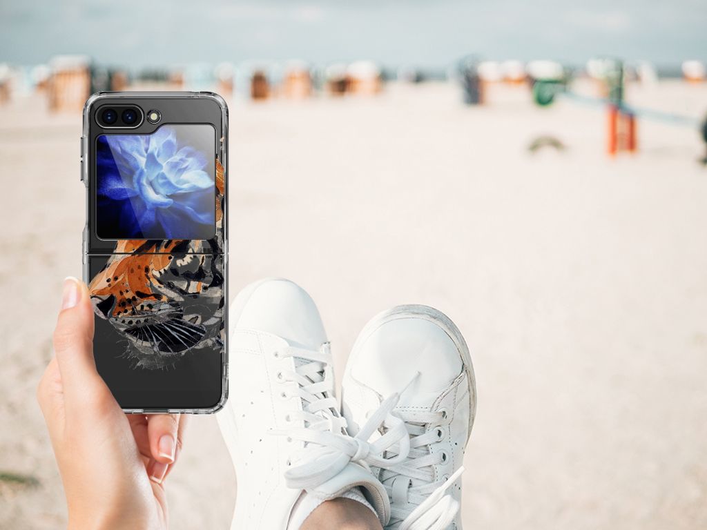 Omdat we tijgers zo bijzonder vinden, hebben we besloten deze voor zeer lage kosten voor jou op een Samsung Galaxy Z Flip 5 Hoesje maken te zetten. Dit kunnen we goedkoop doen omdat we het drukwerk in eigen beheer doen. De tijger staat geschilderd op de tpu case tegen een grijs met wit geblokte achtergrond. De Watercolor Tiger kunnen we bedrukken op verschillende soorten hoesjes, zoals deze tpu cases. Deze case kan exclusief in het bezit van jou komen. Zeker als je er zelf nog unieke teksten en/of beelden aan toevoegt. Het tpu hoesje is zeer flexibel en wordt alleen aan de bovenzijde bedrukt met de tijger. De randen van dit flexibele hoesje blijven doorzichtig. Jij zorgt voor de perfecte bescherming van je smartphone met dit tpu hoesje met geschilderde tijger tegen een grijs met witte achtergrond.