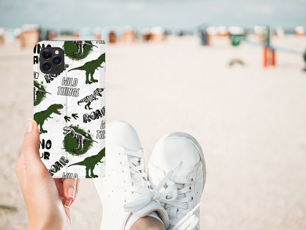 Ook zo gek op alles met dinosaurussen te maken heeft? Dan mag dit hoesje met dino’s zeker niet ontbreken in jouw collectie! De skeletten, pootafdrukken en dino’s zorgen er hopelijk voor dat iedereen van jouw Apple iPhone 11 Pro Max afblijft! Dit toffe dino design wordt geprint op een Hoesje maken waarin je een pasje kwijt kunt. Vouw het hoesje om en zet het horizontaal neer voor als je graag filmpjes op je Apple iPhone 11 Pro Max kijkt. De magneten aan de binnenkant zorgen ervoor dat het hoesje dicht blijft in bijv. je tas. Bescherm je smartphone vandaag nog met dit gevaarlijke Dinosaurus design hoesje!
