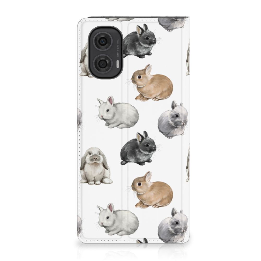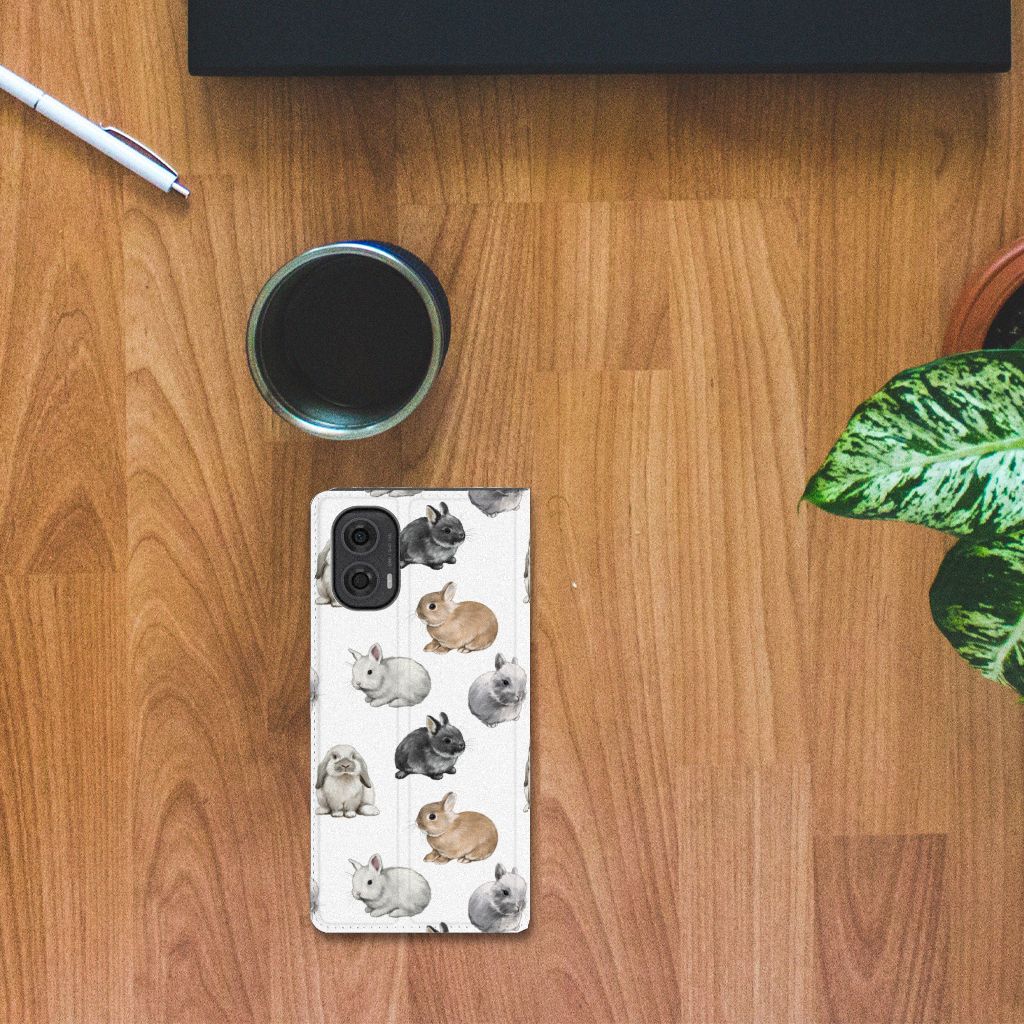 Wist je dat er wel 50 verschillende konijnenrassen zijn die zich onderscheiden in kleur, vacht, bouw en formaat? Daarom kon dit design met konijntjes eigenlijk niet ontbreken in onze collectie hoesjes. Wij zijn in ieder geval helemaal verliefd op deze schattige konijntjes. Dit design wordt geprint op een Hoesje maken speciaal op maat gemaakt voor de Motorola Moto G24 | G04 | G24 Power. In dit hoesje kun je een pasje kwijt, super fijn toch? Vouw het hoesje om en zet het horizontaal neer voor als je graag filmpjes op je Motorola Moto G24 | G04 | G24 Power kijkt. De magneten aan de binnenkant zorgen ervoor dat het hoesje dicht blijft in bijv. je tas. Bescherm jouw smartphone vandaag nog met dit super schattige hoesje met konijntjes!