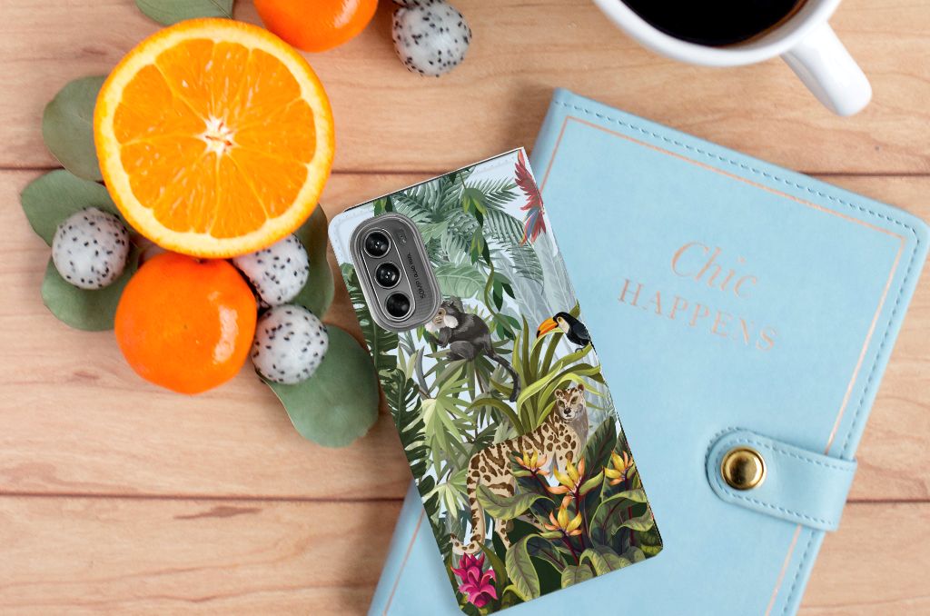Ben je op zoek naar een tropische verrassing voor je Motorola Moto G62 5G? Dan is dit hoesje in jungle stijl zeker iets voor jou! Met de verschillende soorten dieren waan je je even in de jungle, vind je ook niet? Dit design wordt geprint op een Hoesje maken waarin je een pasje kwijt kunt. Vouw het hoesje om en zet het horizontaal neer voor als je graag filmpjes op je Motorola Moto G62 5G kijkt. De magneten aan de binnenkant zorgen ervoor dat het hoesje dicht blijft in bijv. je tas. Bescherm jouw smartphone vandaag nog met dit stoere jungle design hoesje!