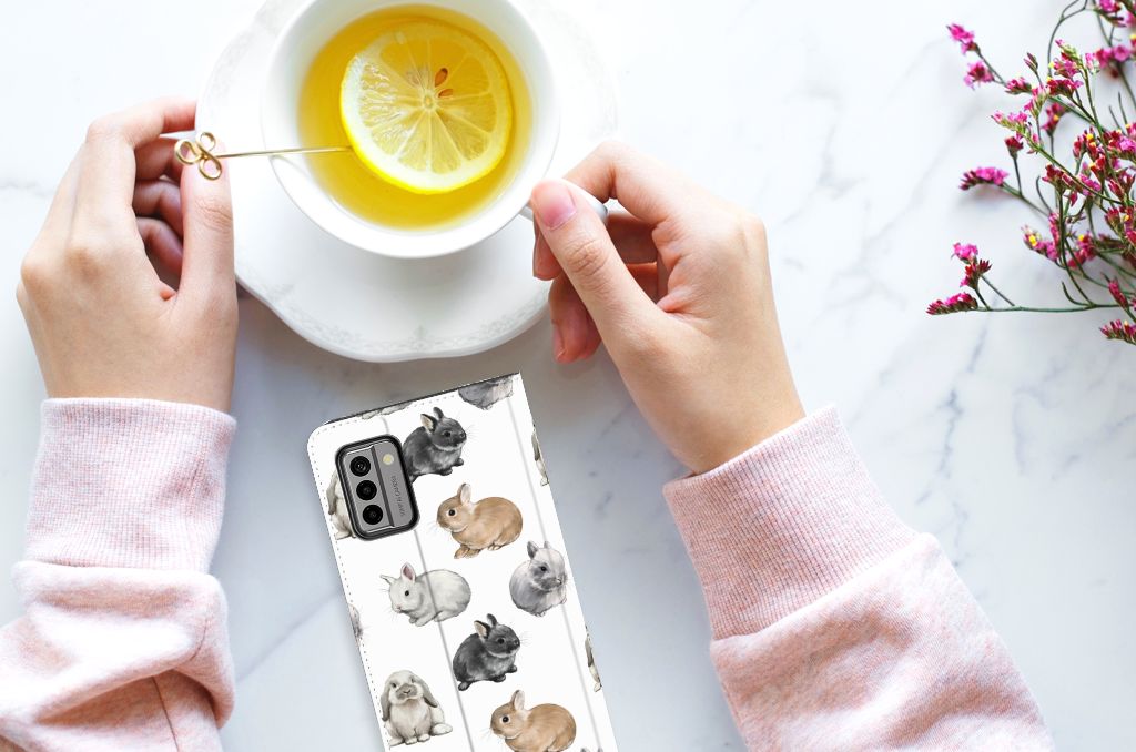 Wist je dat er wel 50 verschillende konijnenrassen zijn die zich onderscheiden in kleur, vacht, bouw en formaat? Daarom kon dit design met konijntjes eigenlijk niet ontbreken in onze collectie hoesjes. Wij zijn in ieder geval helemaal verliefd op deze schattige konijntjes. Dit design wordt geprint op een Hoesje maken speciaal op maat gemaakt voor de Nokia G22. In dit hoesje kun je een pasje kwijt, super fijn toch? Vouw het hoesje om en zet het horizontaal neer voor als je graag filmpjes op je Nokia G22 kijkt. De magneten aan de binnenkant zorgen ervoor dat het hoesje dicht blijft in bijv. je tas. Bescherm jouw smartphone vandaag nog met dit super schattige hoesje met konijntjes!