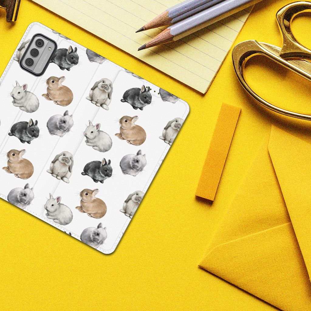Wist je dat er wel 50 verschillende konijnenrassen zijn die zich onderscheiden in kleur, vacht, bouw en formaat? Daarom kon dit design met konijntjes eigenlijk niet ontbreken in onze collectie hoesjes. Wij zijn in ieder geval helemaal verliefd op deze schattige konijntjes. Dit design wordt geprint op een Hoesje maken speciaal op maat gemaakt voor de Nokia G42. In dit hoesje kun je een pasje kwijt, super fijn toch? Vouw het hoesje om en zet het horizontaal neer voor als je graag filmpjes op je Nokia G42 kijkt. De magneten aan de binnenkant zorgen ervoor dat het hoesje dicht blijft in bijv. je tas. Bescherm jouw smartphone vandaag nog met dit super schattige hoesje met konijntjes!