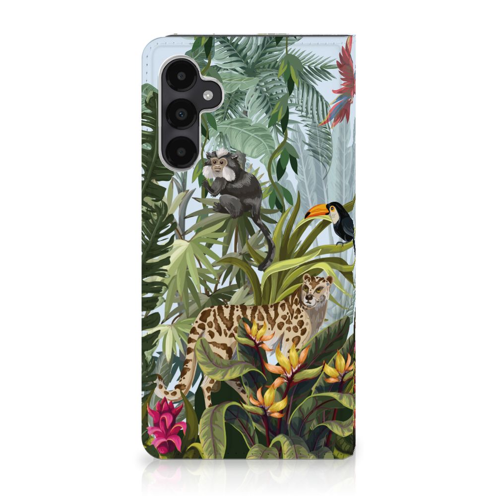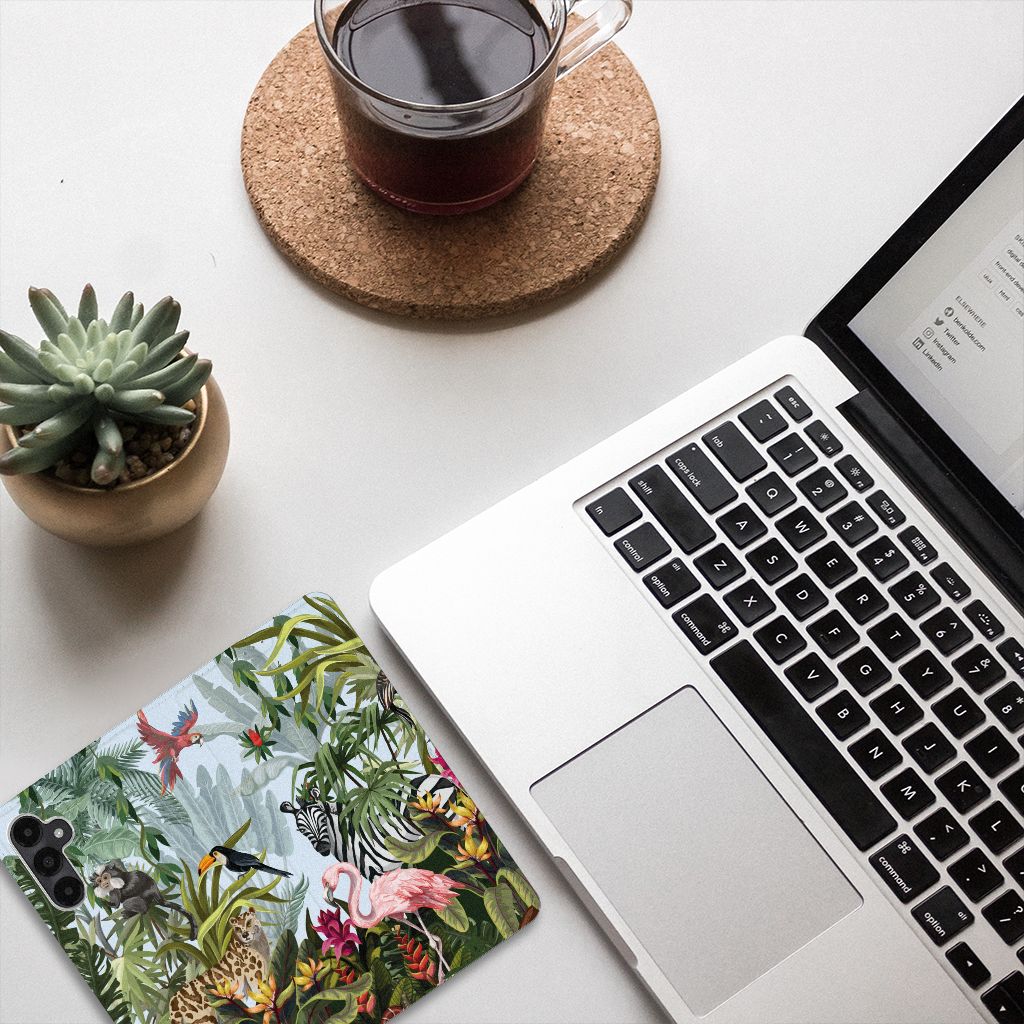 Ben je op zoek naar een tropische verrassing voor je Samsung Galaxy A05s? Dan is dit hoesje in jungle stijl zeker iets voor jou! Met de verschillende soorten dieren waan je je even in de jungle, vind je ook niet? Dit design wordt geprint op een Hoesje maken waarin je een pasje kwijt kunt. Vouw het hoesje om en zet het horizontaal neer voor als je graag filmpjes op je Samsung Galaxy A05s kijkt. De magneten aan de binnenkant zorgen ervoor dat het hoesje dicht blijft in bijv. je tas. Bescherm jouw smartphone vandaag nog met dit stoere jungle design hoesje!