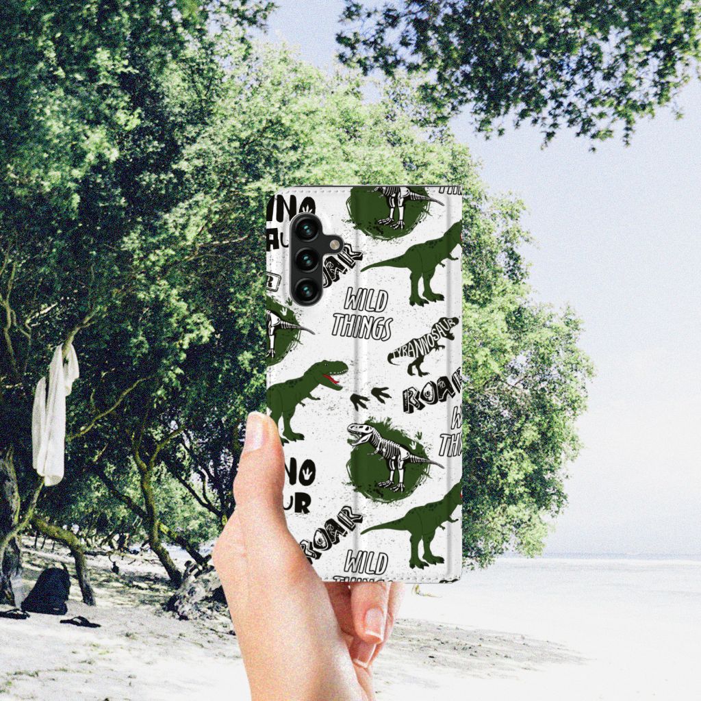 Ook zo gek op alles met dinosaurussen te maken heeft? Dan mag dit hoesje met dino’s zeker niet ontbreken in jouw collectie! De skeletten, pootafdrukken en dino’s zorgen er hopelijk voor dat iedereen van jouw Samsung Galaxy A13 (5G) | Samsung Galaxy A04s afblijft! Dit toffe dino design wordt geprint op een Hoesje maken waarin je een pasje kwijt kunt. Vouw het hoesje om en zet het horizontaal neer voor als je graag filmpjes op je Samsung Galaxy A13 (5G) | Samsung Galaxy A04s kijkt. De magneten aan de binnenkant zorgen ervoor dat het hoesje dicht blijft in bijv. je tas. Bescherm je smartphone vandaag nog met dit gevaarlijke Dinosaurus design hoesje!