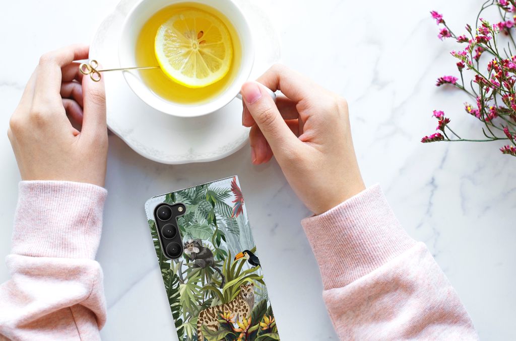 Ben je op zoek naar een tropische verrassing voor je Samsung Galaxy S23 Plus? Dan is dit hoesje in jungle stijl zeker iets voor jou! Met de verschillende soorten dieren waan je je even in de jungle, vind je ook niet? Dit design wordt geprint op een Hoesje maken waarin je een pasje kwijt kunt. Vouw het hoesje om en zet het horizontaal neer voor als je graag filmpjes op je Samsung Galaxy S23 Plus kijkt. De magneten aan de binnenkant zorgen ervoor dat het hoesje dicht blijft in bijv. je tas. Bescherm jouw smartphone vandaag nog met dit stoere jungle design hoesje!