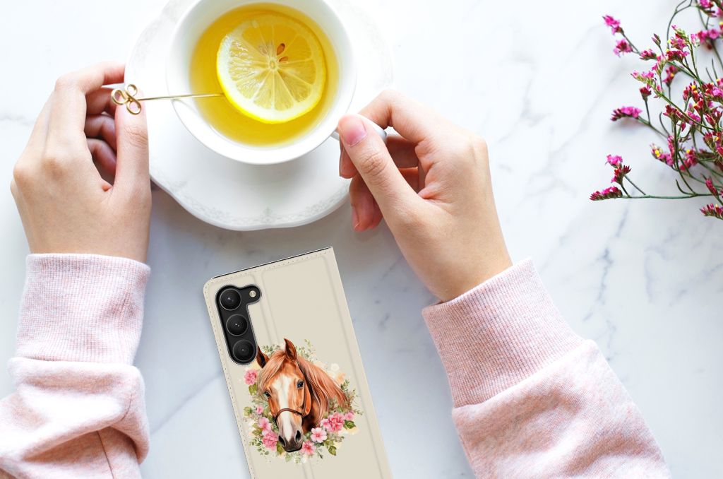 Toen we in 2014 begonnen met het bedrukken van telefoonhoesjes, was een van de eerste designs eentje met paarden erop. Nu zoveel jaar later is dit een van onze populairste hoesjes voor zowel jong als oud. Vandaar dat we nog een design toevoegen aan onze collectie met een paard erop, hopelijk wordt dit design net zo geliefd! Het design wordt geprint op een Hoesje maken speciaal op maat gemaakt voor de Samsung Galaxy S23 Plus. In dit hoesje kun je een pasje kwijt, super fijn toch? Vouw het hoesje om en zet het horizontaal neer voor als je graag filmpjes op je Samsung Galaxy S23 Plus kijkt. De magneten aan de binnenkant zorgen ervoor dat het hoesje dicht blijft in bijv. je tas. Bescherm jouw smartphone vandaag nog met dit mooie design hoesje!