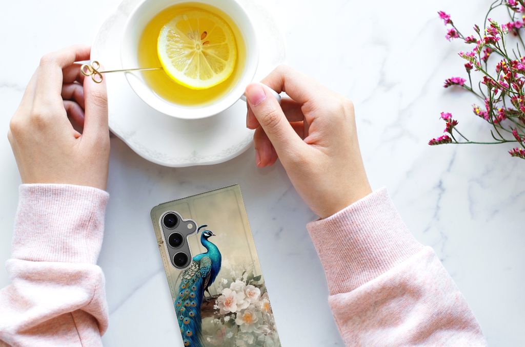 Wist je dat de sleep van pauwen bestaat uit wel 150 kleurige veren? Als de haan zijn sleep opzet om een vrouwtje te veroveren dan zie je deze veren het duidelijkst. Er zijn mensen die geloven dat een pauwenveer geluk brengt! Daarom mag dit romantische vintage pauwen design zeker niet ontbreken in onze collectie. Het blijven toch echt prachtige en fascinerende dieren om te zien! Dit design wordt geprint op een Hoesje maken speciaal op maat gemaakt voor de Samsung Galaxy S24. In dit hoesje kun je een pasje kwijt, super fijn toch? Vouw het hoesje om en zet het horizontaal neer voor als je graag filmpjes op je Samsung Galaxy S24 kijkt. De magneten aan de binnenkant zorgen ervoor dat het hoesje dicht blijft in bijv. je tas. Bescherm jouw smartphone vandaag nog met dit romantische pauwen design hoesje!