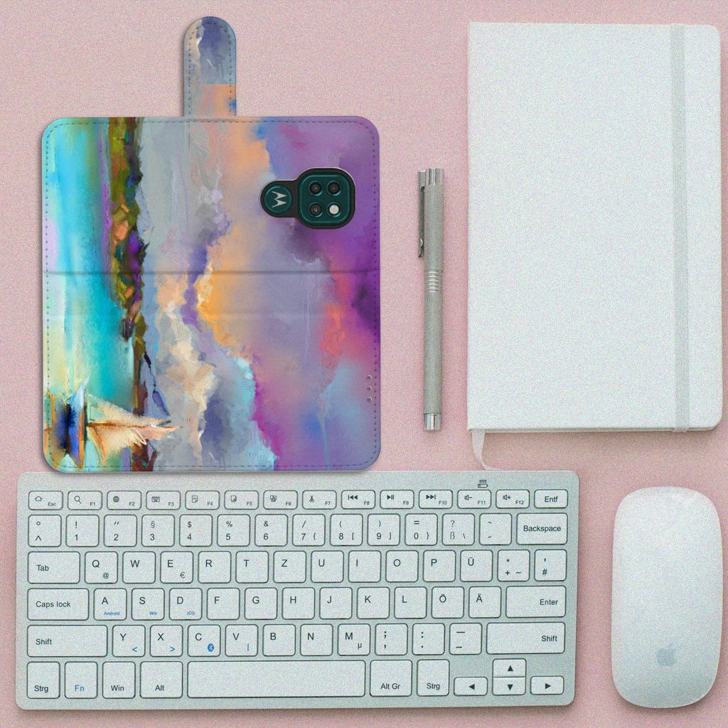 Het design op dit artistieke hoesje met de verschillende tinten van paars, blauw en groen zou je zo zelf op de muur kunnen hangen. Het design laat een boot zien maar dan is hij wat abstracter geverfd met door elkaar lopende kleuren. Als jij houdt van kunst dan is dit artistieke hoesje wat voor jou. Wat het ontwerp extra mooi maakt is dat de gehele bookcase is bedrukt inclusief het magnetische lipje wat als sluiting wordt gebruikt. Het andere voordeel van een bookcase is dat jouw telefoon aan alle kanten is beschermd, ook als je hem op zijn scherm laat vallen is er niks aan de hand en wordt jouw telefoon goed beschermd door het kunstleer wat eromheen zit. Het magnetische lipje zorgt er dan weer voor dat het Motorola Moto G9 Play | E7 Plus Hoesje op zijn plek blijft zitten en dat jouw telefoon aan alle kanten beschermd blijft.
