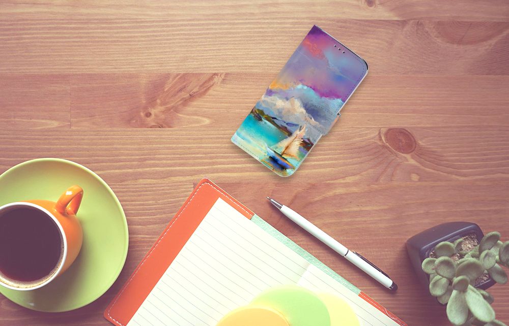 Het design op dit artistieke hoesje met de verschillende tinten van paars, blauw en groen zou je zo zelf op de muur kunnen hangen. Het design laat een boot zien maar dan is hij wat abstracter geverfd met door elkaar lopende kleuren. Als jij houdt van kunst dan is dit artistieke hoesje wat voor jou. Wat het ontwerp extra mooi maakt is dat de gehele bookcase is bedrukt inclusief het magnetische lipje wat als sluiting wordt gebruikt. Het andere voordeel van een bookcase is dat jouw telefoon aan alle kanten is beschermd, ook als je hem op zijn scherm laat vallen is er niks aan de hand en wordt jouw telefoon goed beschermd door het kunstleer wat eromheen zit. Het magnetische lipje zorgt er dan weer voor dat het Samsung Galaxy A20e Hoesje op zijn plek blijft zitten en dat jouw telefoon aan alle kanten beschermd blijft.