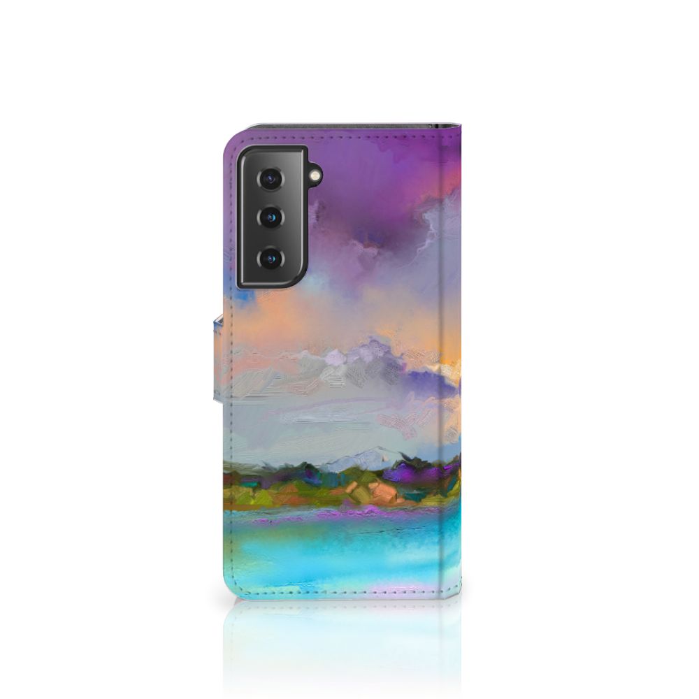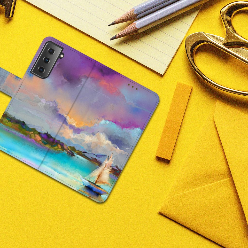 Het design op dit artistieke hoesje met de verschillende tinten van paars, blauw en groen zou je zo zelf op de muur kunnen hangen. Het design laat een boot zien maar dan is hij wat abstracter geverfd met door elkaar lopende kleuren. Als jij houdt van kunst dan is dit artistieke hoesje wat voor jou. Wat het ontwerp extra mooi maakt is dat de gehele bookcase is bedrukt inclusief het magnetische lipje wat als sluiting wordt gebruikt. Het andere voordeel van een bookcase is dat jouw telefoon aan alle kanten is beschermd, ook als je hem op zijn scherm laat vallen is er niks aan de hand en wordt jouw telefoon goed beschermd door het kunstleer wat eromheen zit. Het magnetische lipje zorgt er dan weer voor dat het Samsung Galaxy S21 Hoesje op zijn plek blijft zitten en dat jouw telefoon aan alle kanten beschermd blijft.