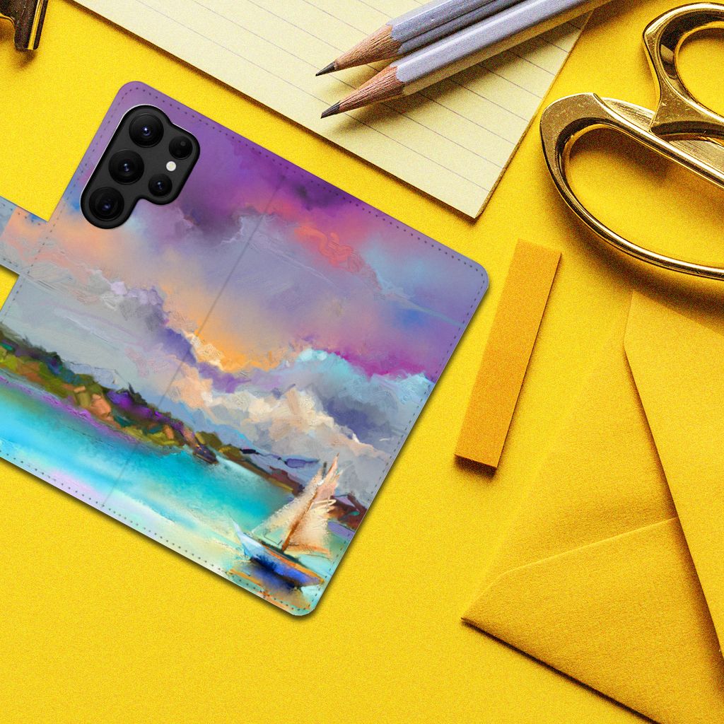 Het design op dit artistieke hoesje met de verschillende tinten van paars, blauw en groen zou je zo zelf op de muur kunnen hangen. Het design laat een boot zien maar dan is hij wat abstracter geverfd met door elkaar lopende kleuren. Als jij houdt van kunst dan is dit artistieke hoesje wat voor jou. Wat het ontwerp extra mooi maakt is dat de gehele bookcase is bedrukt inclusief het magnetische lipje wat als sluiting wordt gebruikt. Het andere voordeel van een bookcase is dat jouw telefoon aan alle kanten is beschermd, ook als je hem op zijn scherm laat vallen is er niks aan de hand en wordt jouw telefoon goed beschermd door het kunstleer wat eromheen zit. Het magnetische lipje zorgt er dan weer voor dat het Samsung Galaxy S23 Ultra Hoesje op zijn plek blijft zitten en dat jouw telefoon aan alle kanten beschermd blijft.