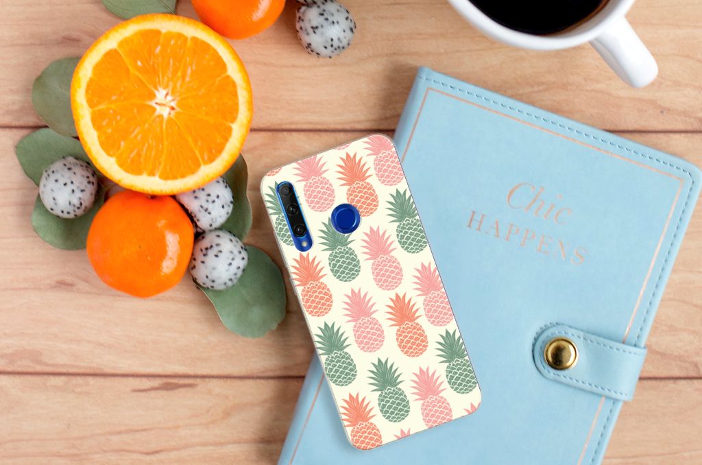 Ananas is een woord uit het Tupi, de taal van de Tupi-indianen, en betekent uitmuntende vrucht. Dit fruit van zeer hoge kwaliteit staat op onze superieure boekhoesjes, stand cases, hard cases en TPU cases. Jij blijft er gezond uitzien als je zo nu en dan een hap neemt van een Ananas , jouw smartphone blijft tip top in orde als je er een leuk telefoonhoesje omheen doet. Een ananas heeft stevig, veerkrachtig vruchtvlees. Een beetje te vergelijken met het TPU in onze hoesjes. TPU is elastisch materiaal, dat zeer buigzaam is. Vandaar dat het zeer schokbestendig is. Het ananas design staat op een staat op een TPU case. Deze Honor 20 Lite Siliconen Case wordt alleen aan de bovenkant bedrukt en is zeer flexibel. De randen van het hoesje blijven transparant.